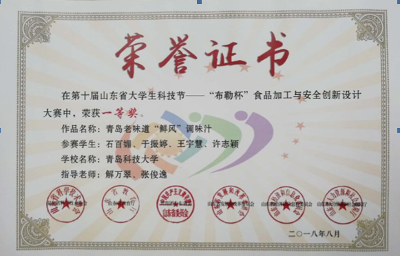 近日,第十届山东省老员工科技节——“布勒杯”食品加工与安全创新设计大赛在中华全国供销合作总社济南果品研究院众创空间举行。“布勒杯”食品加工与安全创新设计大赛吸引了中国海洋大学、山东农业大学、青岛大学、XC体育等29所高校的279支队伍参加了本次大赛,最终86个项目进入决赛。XC体育海洋科学与XC体育解万翠、张俊逸和马翠萍、王秀丹老师指导的两件作品荣获一等奖。