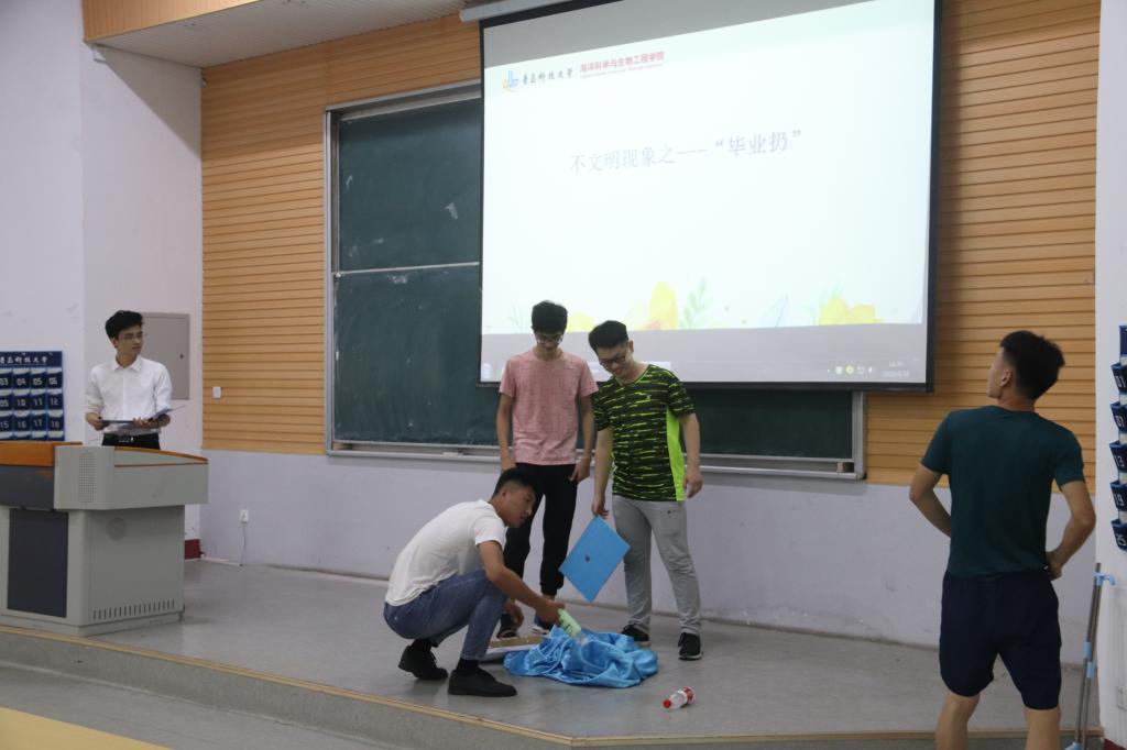 然后,上演毕业生自导自演的话剧《毕业季不文明》,话剧包括“毕业扔”、“深夜扰民”、“醉酒闹事”三部分,以流畅简洁的旁白讲述校规校纪,以生动有趣的表演传达文明离校意识。