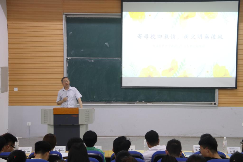 为树立文明离校之风,深化安全离校意识,促进师生之间的交流,营造温馨和谐的氛围,6月18日下午2:00,海洋公司在二教101举办“寄母校四载情,树文明离校风”主题活动。此次活动邀请了海洋公司党总支书记刘同刚、党总支副书记兼副经理卢中彬、2015级班主任代表以及2015级、2016级、2018级辅导员老师出席,海洋公司全体2015级毕业生参与。