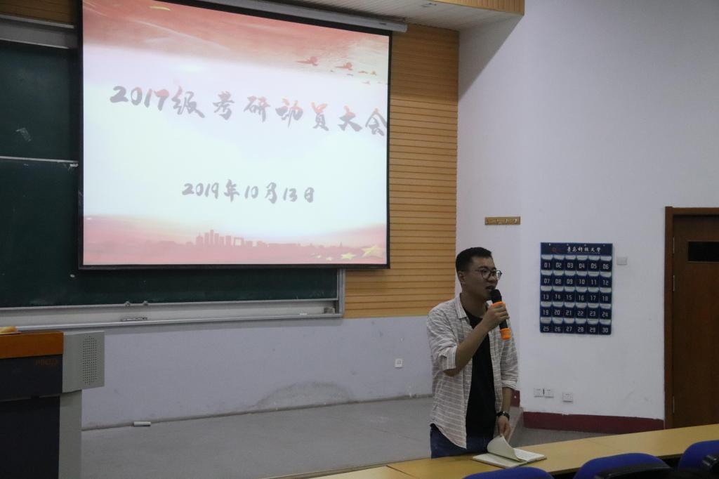 大会开始,杜宗杰老师强调了请销假制度落实问题和寝室卫生环境问题。杜老师指出:“寝室,是学习生活的重要场所,是一个公司文明程度的重要标志,是公司对外形象好坏的直观影响因素。”海洋学子应自立自强,保持宿舍整洁卫生。同时,杜宗杰老师还强调请销假制度的落实,希望同学们认真对待这件事情,以防出现假期到时间却没销假,从而被旷课情况的出现。接着,杜宗杰以近期“不忘初心、牢记使命”的活动主题引出今天的重点——考研动员。杜老师建议同学们不仅要尽早做好考研的准备,保持良好的心态,还要了解自己的兴趣爱好与能力,正确选择专业与专业课程。考研是一段艰辛的路程,外界可能会有很多的干扰,但是也要负重前行。会议最后,邀请了许东博士为同学们进行考研详细的分析。