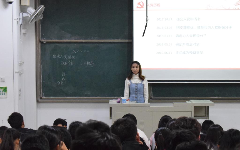 随后,魏成波和薛雨欣作为优秀党员代表分别分享了他们的入党历程。他们在介绍了一名优秀党员应有的风采的同时也提出,作为党员要做学习上的排头兵、工作上的领导者,不仅要有奉献精神,还要从思想、学习、工作、社会实践、科研这五个方面严格要求自己,实现综合发展。两位党员都用自己的亲身经历和实际行动,为2019级同学做出了表率。