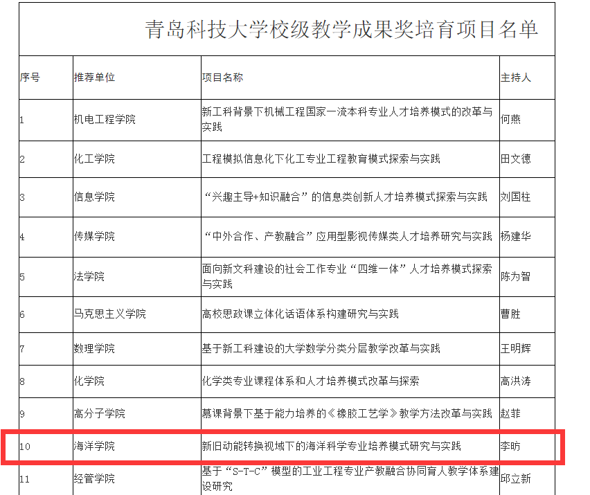 近日,公司公布了2020年度校级教学成果奖培育项目立项结果,其中,海洋公司李昉副教授主持的《新旧动能转换视域下的海洋科学专业培养模式研究与实践》项目获批。