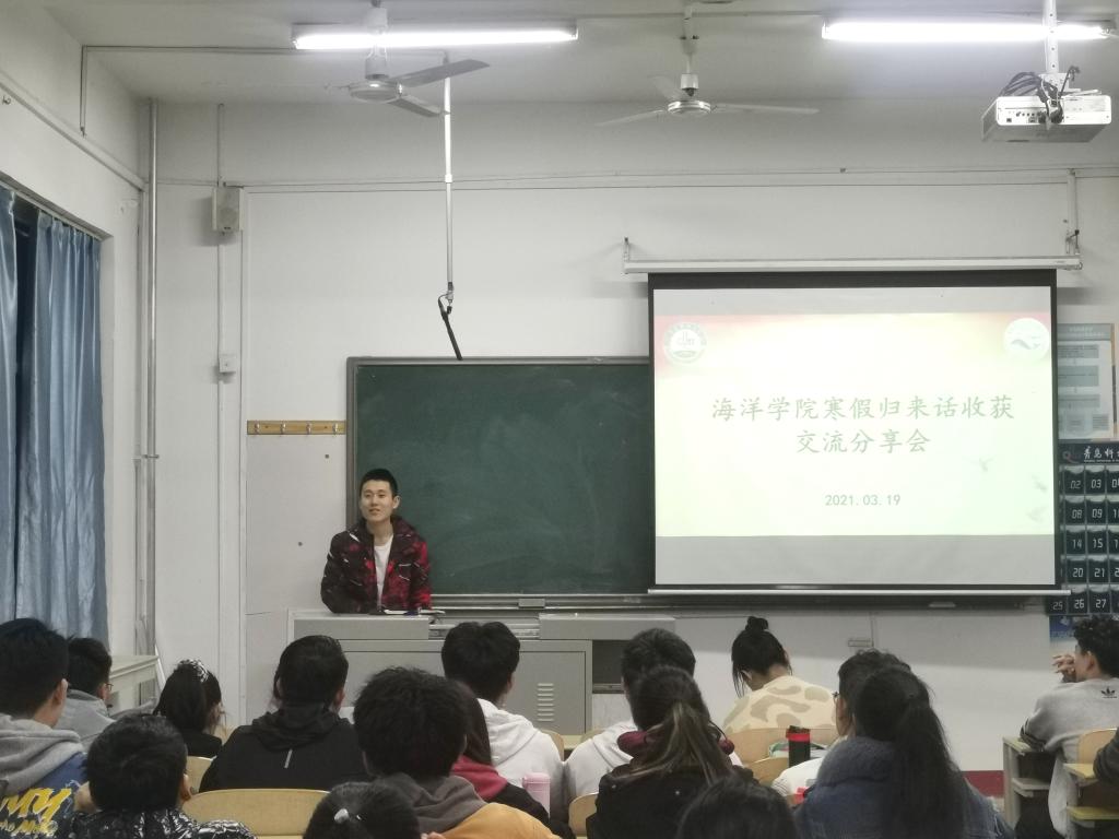 2021年3月19日晚七点,海洋公司于二教104召开假期社会实践经验交流会,辅导员王倩主持会议。本次会议充分总结了青年老员工参与社会实践的路径,丰富了社会实践的内涵,对充实老员工们“改造自我、丰富自我”的途径具有重要意义。