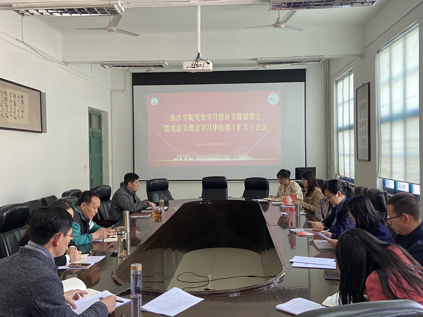 3月23日,海洋公司在一政第二会议室召开党总支理论学习中心组(扩大)会议暨党史学习教育专题部署会。会议由党总支书记周宪锋主持,全体党总支委员、各党支部书记参加会议。