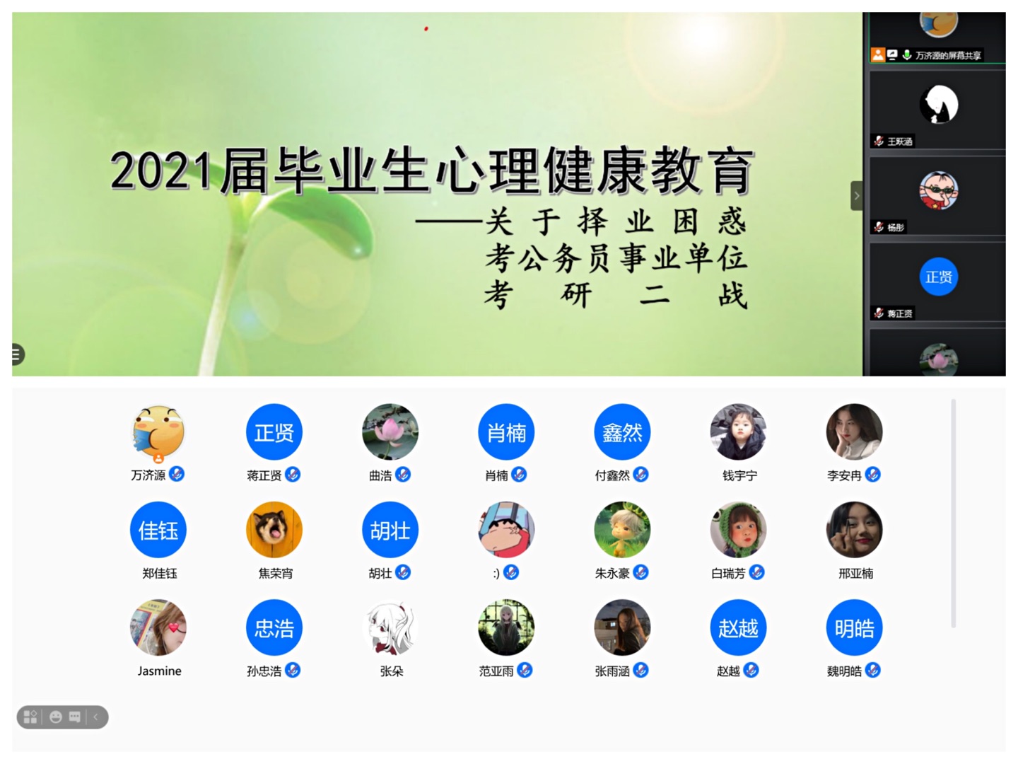 视频连线诉困惑,真情实意解疑难。为帮助大一、大二同学缓解日常学习压力,寻找学习工作的平衡点,找到适合自己的奋斗目标和发展方向,海洋公司组织“说出你的心声”视频连线活动。同学们通过线上交流的方式表达心中所思所感,提出日常学习、生活和工作中的困惑,得到无条件的接纳和全心全意的倾听,高年级的学长学姐就同学所提问题给出了针对性的建议以及鼓励和支持,分享自己的学习经验和生活经历,帮助同学们提高学习动力,加强自我管理能力。