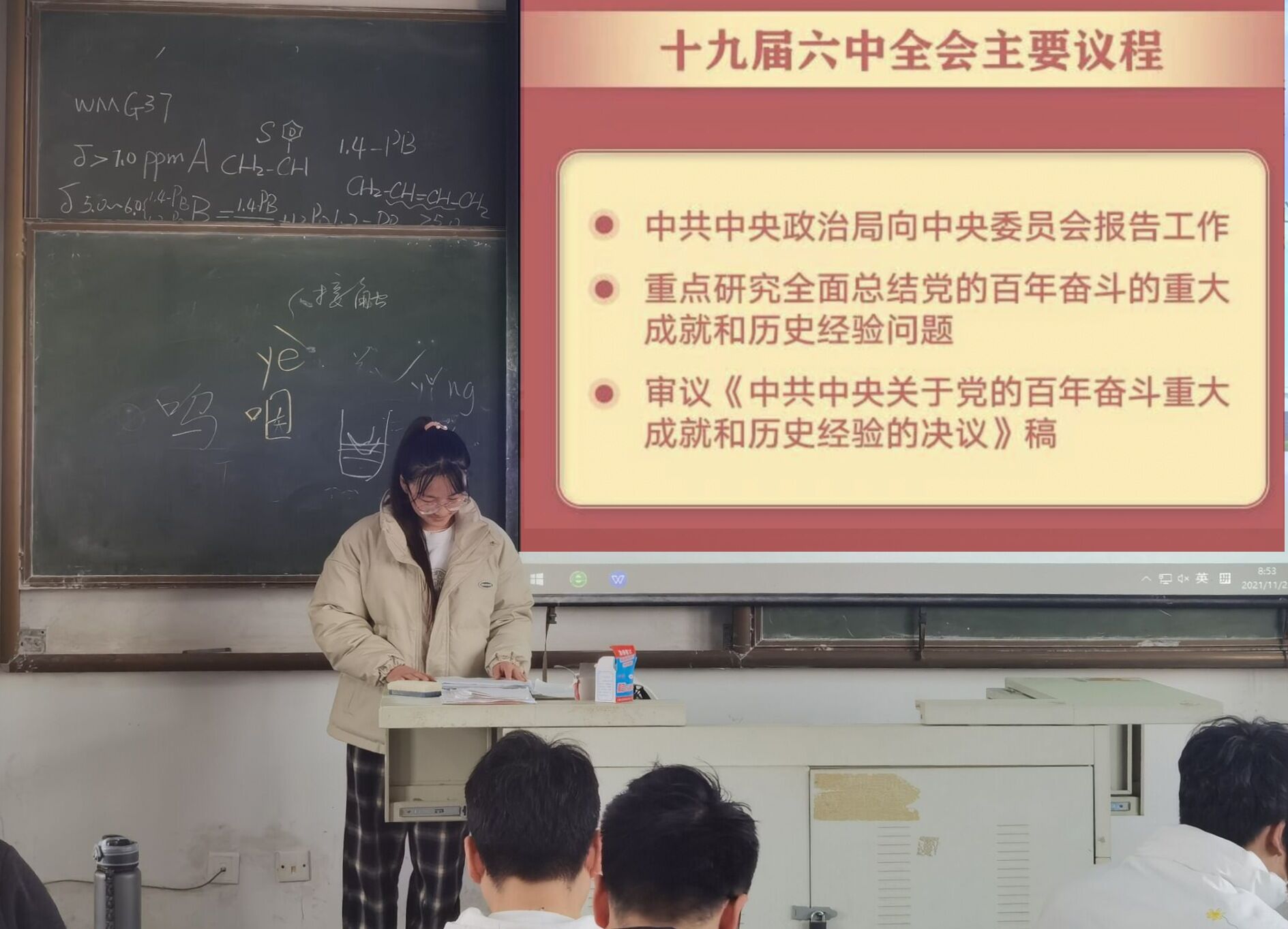 11月23日下午,轻化192团支部全体同学于二教115组织开展“学习十九届六中全会精神”主题团日活动。为深入学习党的十九届六中全会精神,班级同学分别从全会的重要成果、主要内容、经验总结、重大意义四个方面进行学习。
