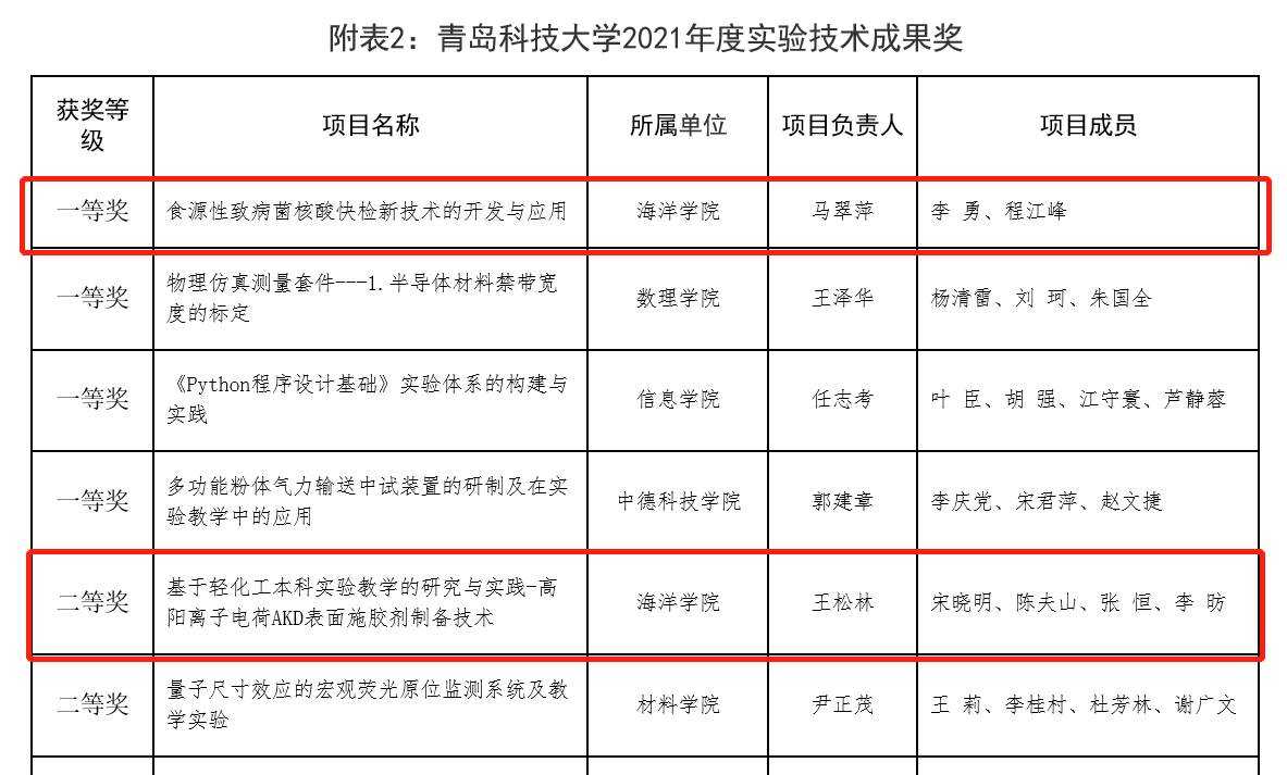 近日,公司公示了2021年度实验教学改革奖及实验技术成果奖评选结果公示评选结果,其中,海洋公司马翠萍经理负责的项目《食源性致病菌核酸快检新技术的开发与应用》获评实验技术成果奖一等奖,王松林老师负责的项目《基于轻化工本科实验教学的研究与实践-高阳离子电荷AKD表面施胶剂制备技术》获评实验技术成果奖二等奖。