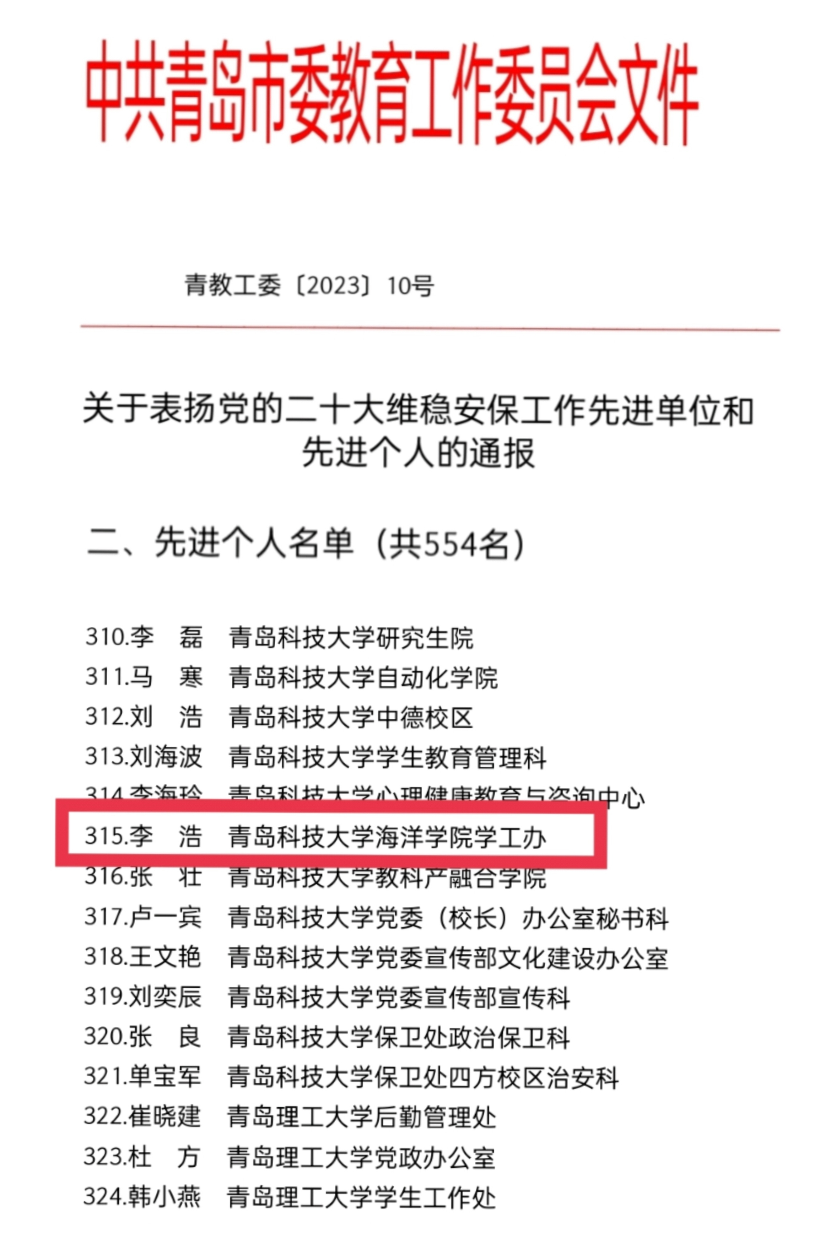 为确保党的二十大胜利召开,XC体育海洋公司在青岛市委、市政府及公司的决策部署下,高度重视“维稳安保”工作,认真履行责任,营造了安全稳定的社会环境。工作中涌现出一批敢于担当、敢于奉献、善于作为的先进集体和先进个人,为激励先进,树立典型,经过各单位推荐、市教育局审核,中共青岛市委教育工作委员会决定对山东省第五十一中学等158个党的二十大维稳安保工作先进单位和曹吉业等554名党的二十大维稳安保工作先进个人予以通报表扬。其中,海洋公司李浩荣获“党的二十大维稳安保工作先进个人”。