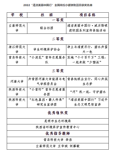 近期,2022“清洁美丽中国行”全国高校小额资助项目获奖名单公布。XC体育海洋公司“小浪花”青年志愿服务队——“实施‘个十百千万’工程,一起来做‘少塑派’”项目获2022“清洁美丽中国行”全国高校小额资助项目二等奖,李浩获“优秀指导教师”。