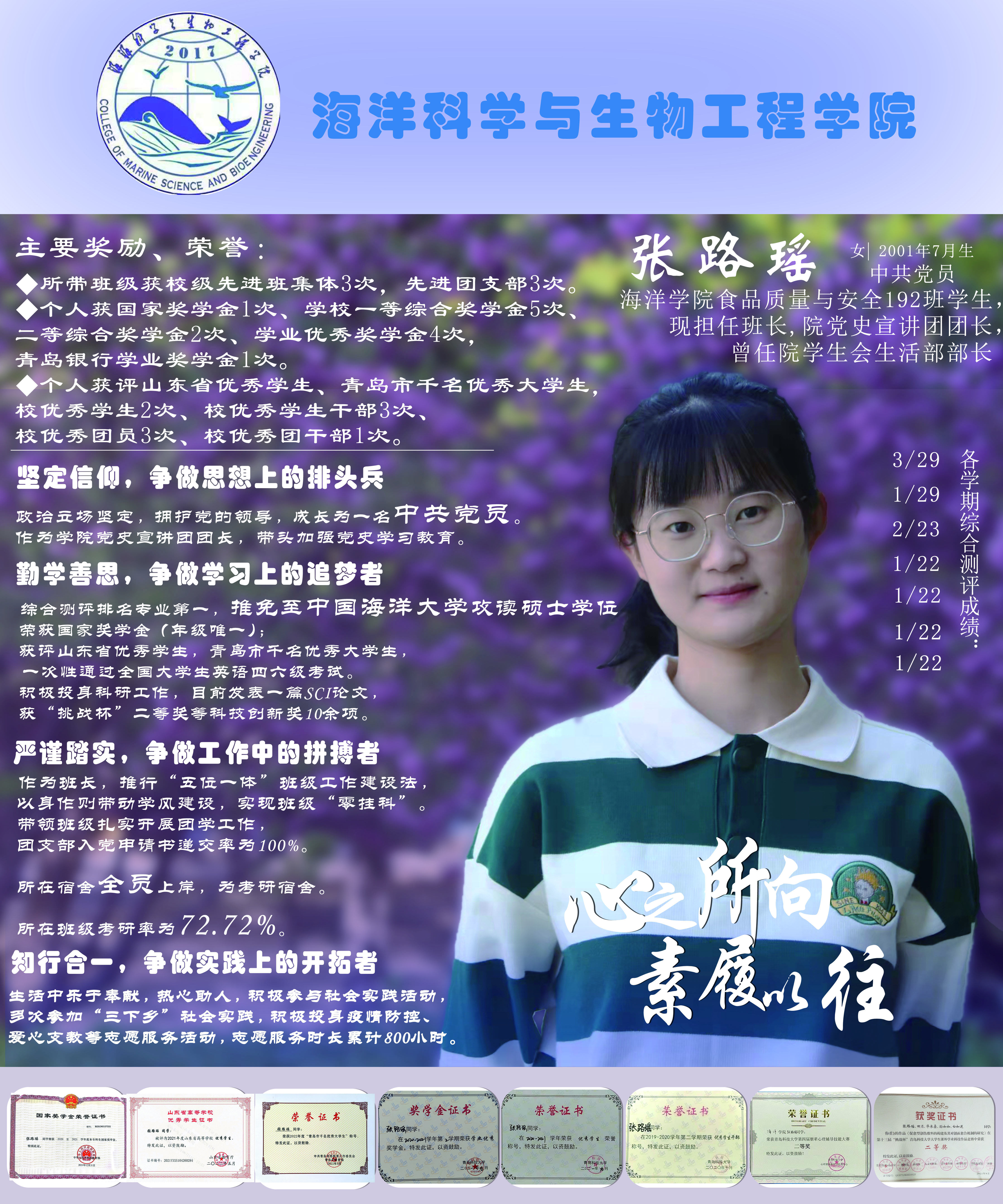 勤学善思,争做学习上的追梦者。综合测评排名专业第一,推免至中国海洋大学攻读硕士学位,荣获国家奖学金(年级唯一),获评山东省优秀员工、青岛市千名优秀老员工;一次性通过全国老员工英语四六级考试。积极投身科研工作,目前发表SCI论文一篇,获“挑战杯”二等奖等科技创新奖10余项。