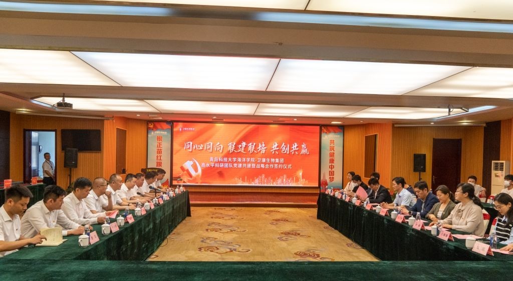 为持续推动学习贯彻习近平新时代中国特色社会主义思想主题教育走深走实、见行见效,围绕开展社会服务调研,进一步推进有组织科研,加强科研团队建设,5月19日,海洋公司和卫康生物集团“同心同向,联建联培,共创共赢”高水平科研团队党建共建合作签约仪式在卫康生物科技园举行。卫康集团董事长王宗继,党委书记王玉平,副书记杜广青,海洋公司党总支书记周宪锋,党总支副书记兼副经理臧传永,海洋生物健康食品科研团队党支部书记解万翠等双方所属党员代表参加此次活动。活动由杜广青主持。