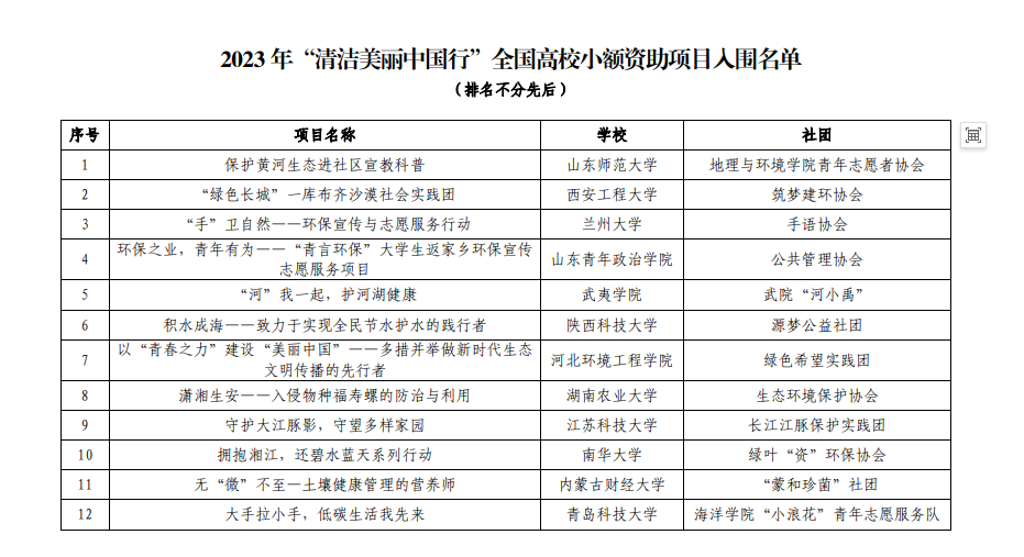 近期,2023“清洁美丽中国行”全国高校小额资助项目入围名单公布。XC体育海洋公司的“小浪花”青年志愿服务队——“大手拉小手,低碳生活我先来”项目,成功入围2023“清洁美丽中国行”全国高校小额资助项目。既“实施‘个十百千万’工程,一起来做‘少塑派’”项目,成功入围2022“清洁美丽中国行”全国高校小额资助项目,再次获此资助。