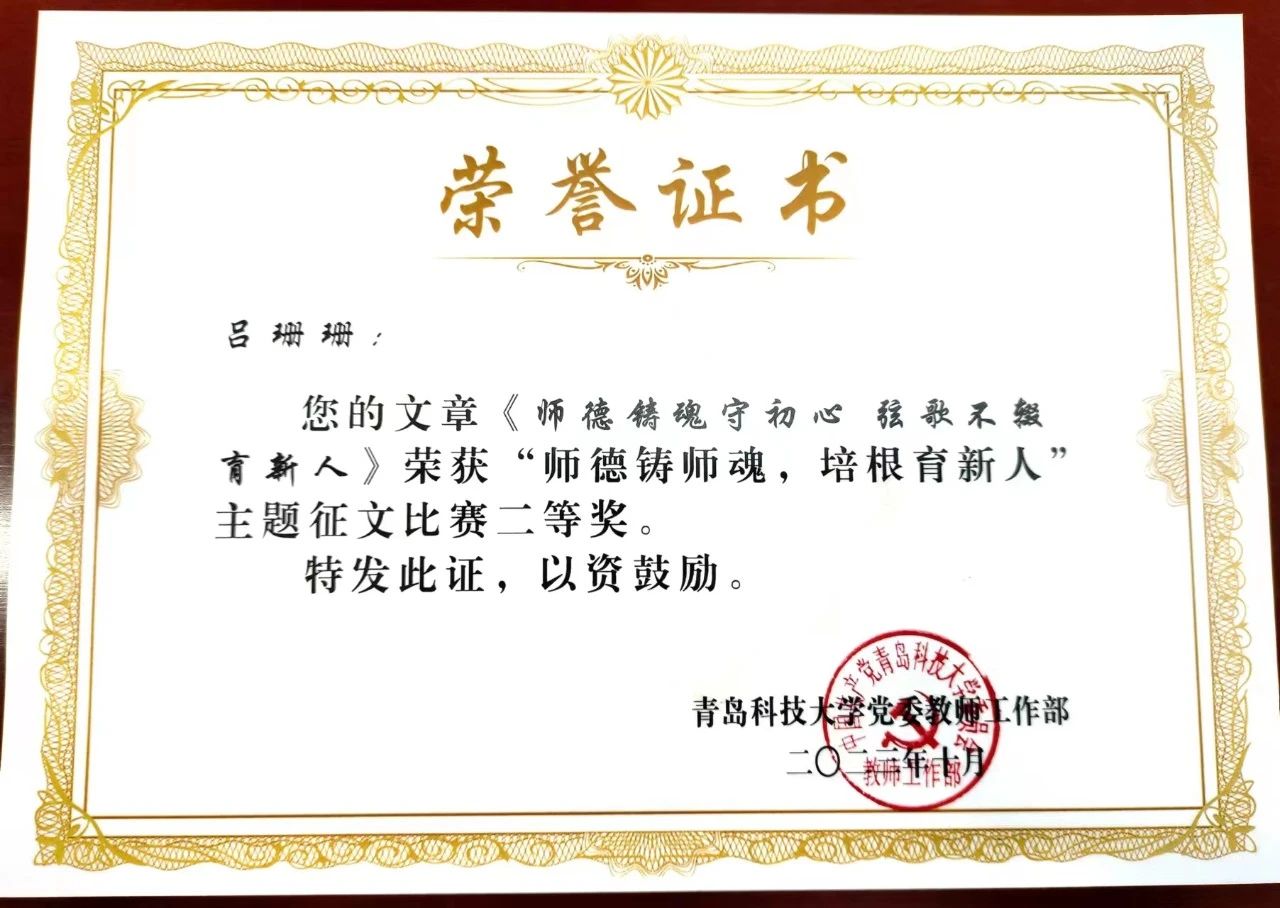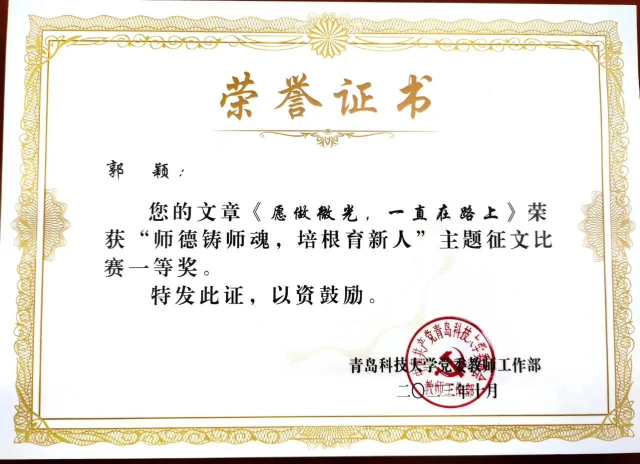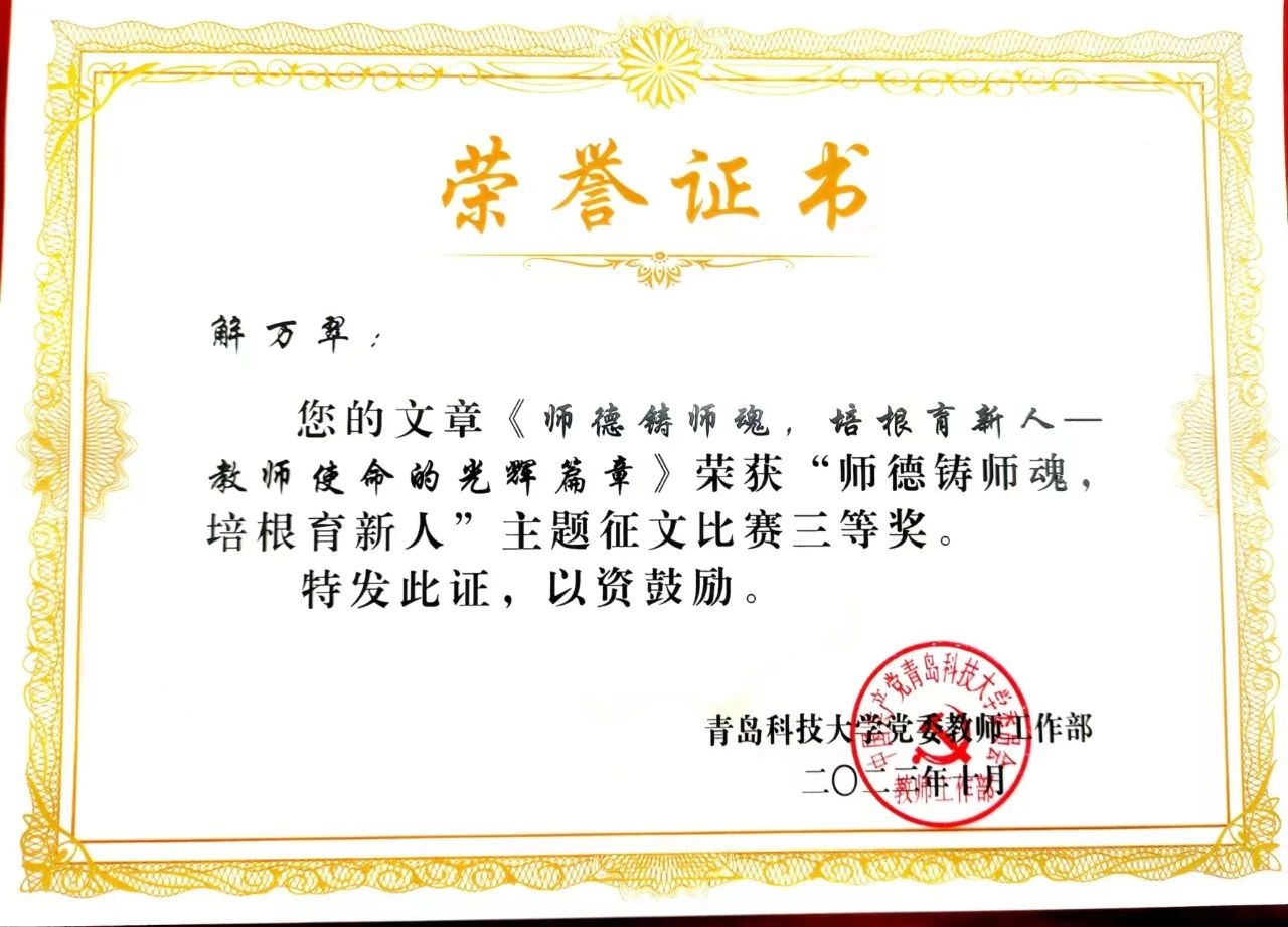 近日,公司公布“师德铸师魂,培根育新人”师德师风主题征文活动获奖结果。海洋公司在此次活动中获多项荣誉,其中,学工办郭颖老师的《愿做微光,一直在路上》荣获一等奖;学工办吕珊珊老师的《师德铸魂守初心 弦歌不辍育新人》荣获二等奖;解万翠教授的《师德铸师魂,培根育新人——教师使命的光辉篇章》和学工办车玉章老师的《不忘来时路 赓续新使命》荣获三等奖。据悉,本次征文活动旨在全面提升广大教师的思想政治素质和职业道德水平,营造尊师重教的浓厚氛围,共产生一等奖5篇,二等奖10篇,三等奖20篇。