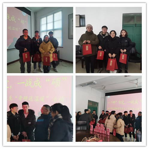 与会领导为考研学子发放考研“大礼包”,有寓意温暖守护”口罩、寓意“保重身体”退烧药、寓意“一战成硕”的定制可乐、寓意“暖心陪伴”的暖宝宝贴,每一件物品都承载着公司对考研学子满满的关心和美好的祝愿。发放过程中,领导们关切询问同学们近期的学习状态及生活作息,鼓励同学们坚定自己的信心。