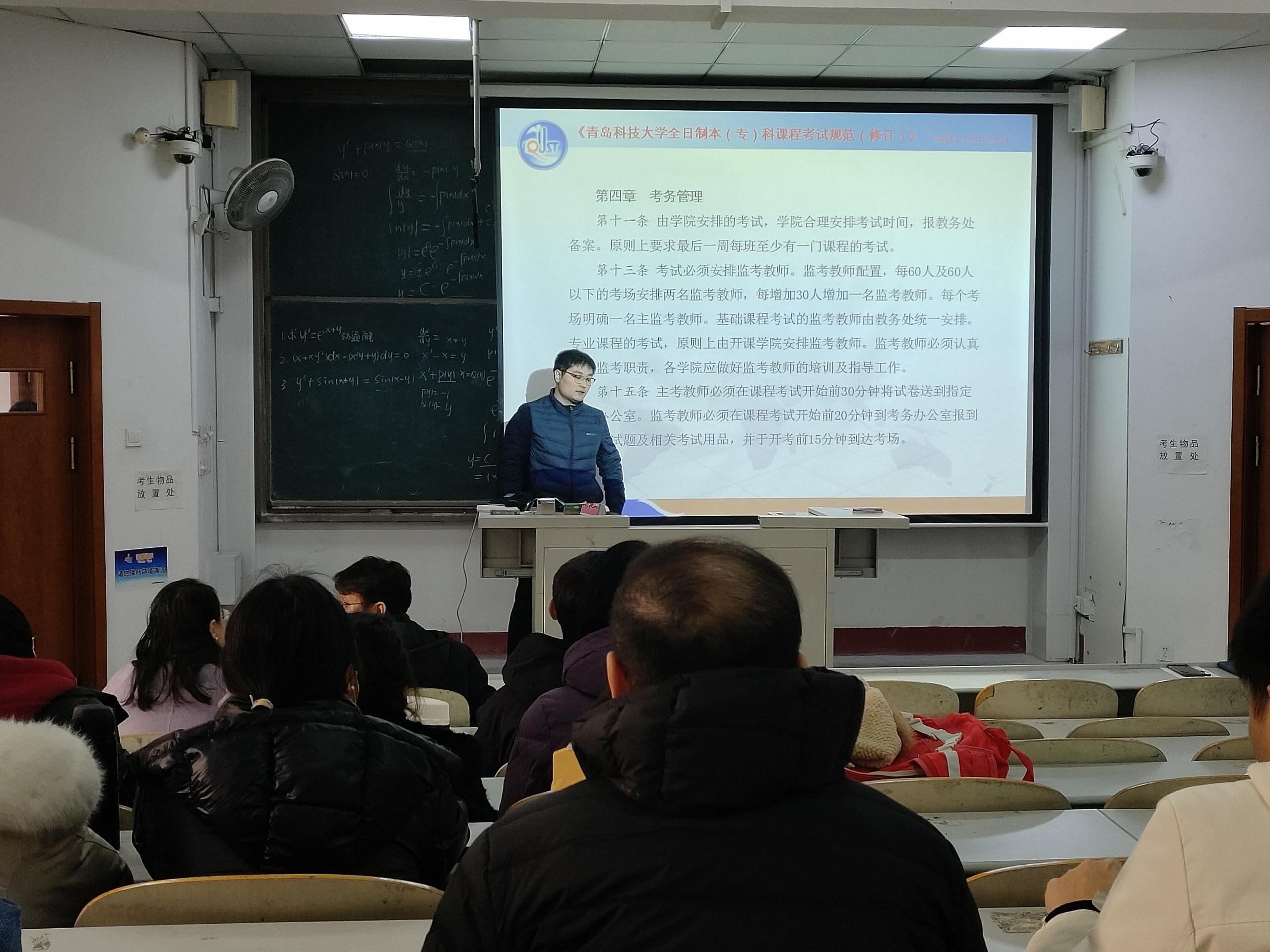 会议第三阶段,马肖飞对教师期末考试监考工作进行培训,结合考务工作中出现的问题,着重强调了监考工作要点,为全体教职工讲解相关细则和员工作弊处理办法,保证期末监考工作顺利开展。