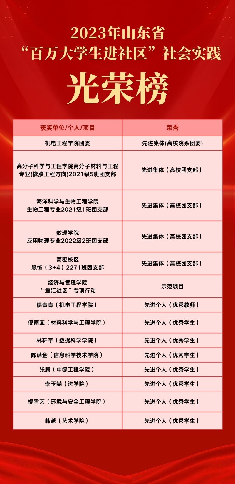 近日,共青团山东省委公布2023年度“百万老员工进社区”表扬通报名单,公司5个先进集体、1个示范项目、8名先进个人获省级“百万老员工进社区”社会实践项目表彰。