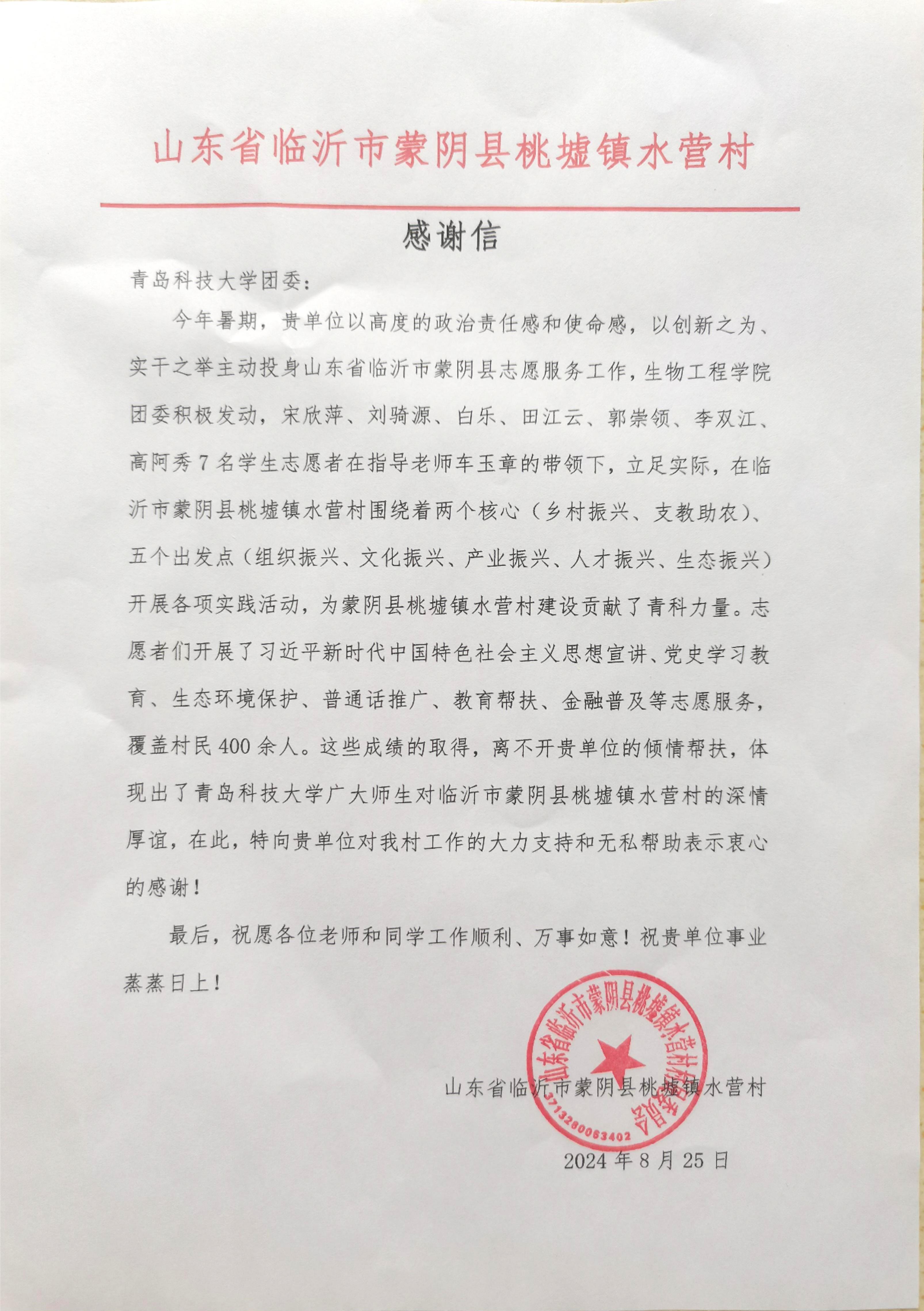 为深入学习贯彻习近平新时代中国特色社会主义思想和党的二十大精神,学习习近平总书记五四青年节对全国广大青年寄语精神,通过社会实践坚定理想信念、站稳人民立场、练就过硬本领、投身强国伟业,7月19日至7月28日,XC体育“山海情”调研团赴临沂市蒙阴县开展暑期社会实践活动。活动过程中,团队成员的优秀表现得到了山东省临沂市蒙阴县桃墟镇水营村的高度赞扬,并发来感谢信。