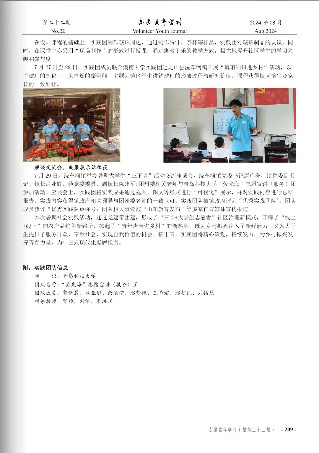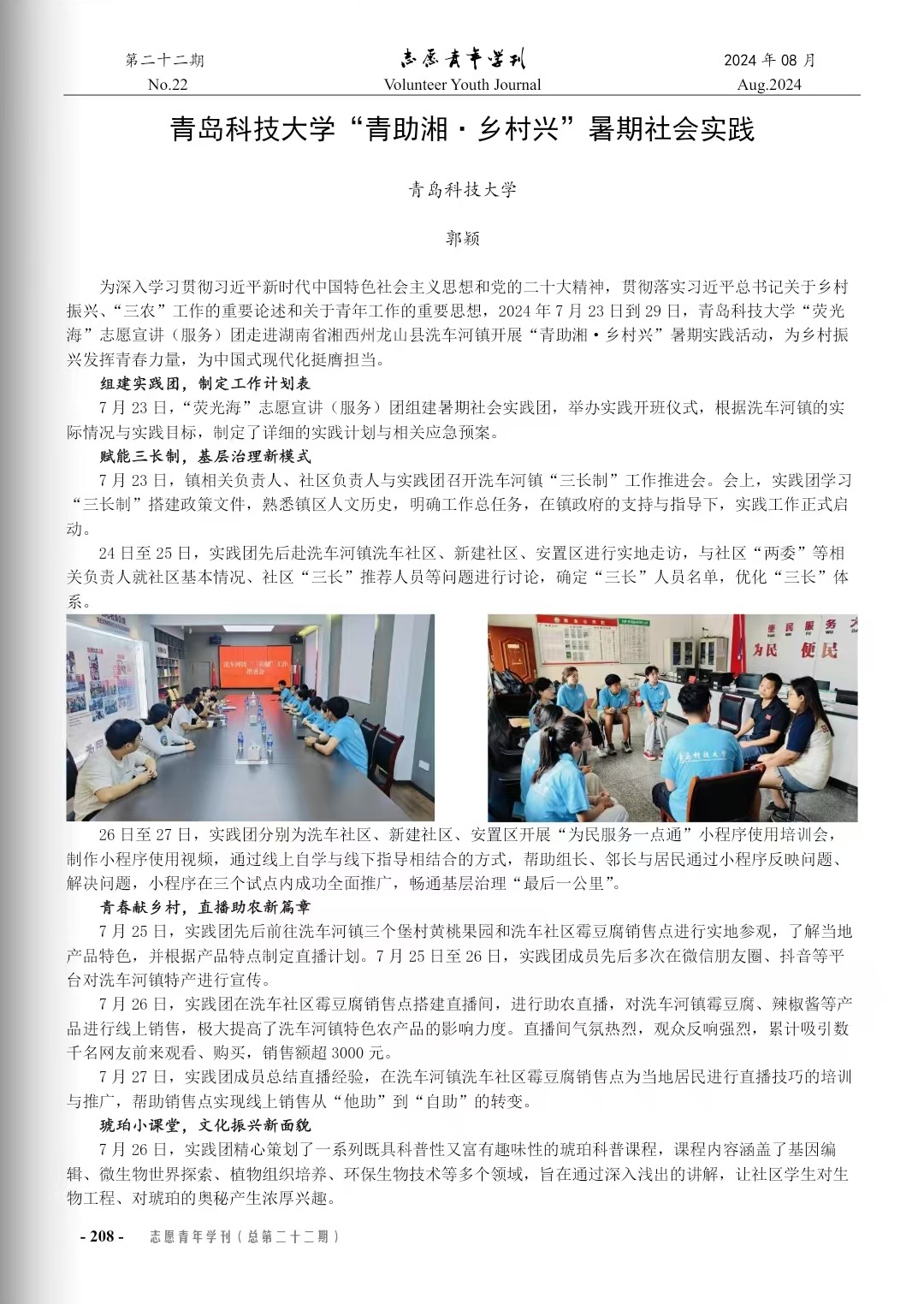近期,由《志愿青年学刊》编辑部开展的2024年暑期“三下乡”社会实践专刊(上辑-活动纪实;2024年8月刊;总第二十二期)征稿审稿录用工作已完成。XC体育由刘浩、秦洪庆、郭颖老师指导的《XC体育“青助湘·乡村兴”暑期社会实践》一文通过编委会审核,已于《志愿青年学刊》2024年暑期“三下乡”社会实践专刊(上辑-活动纪实)发表。
