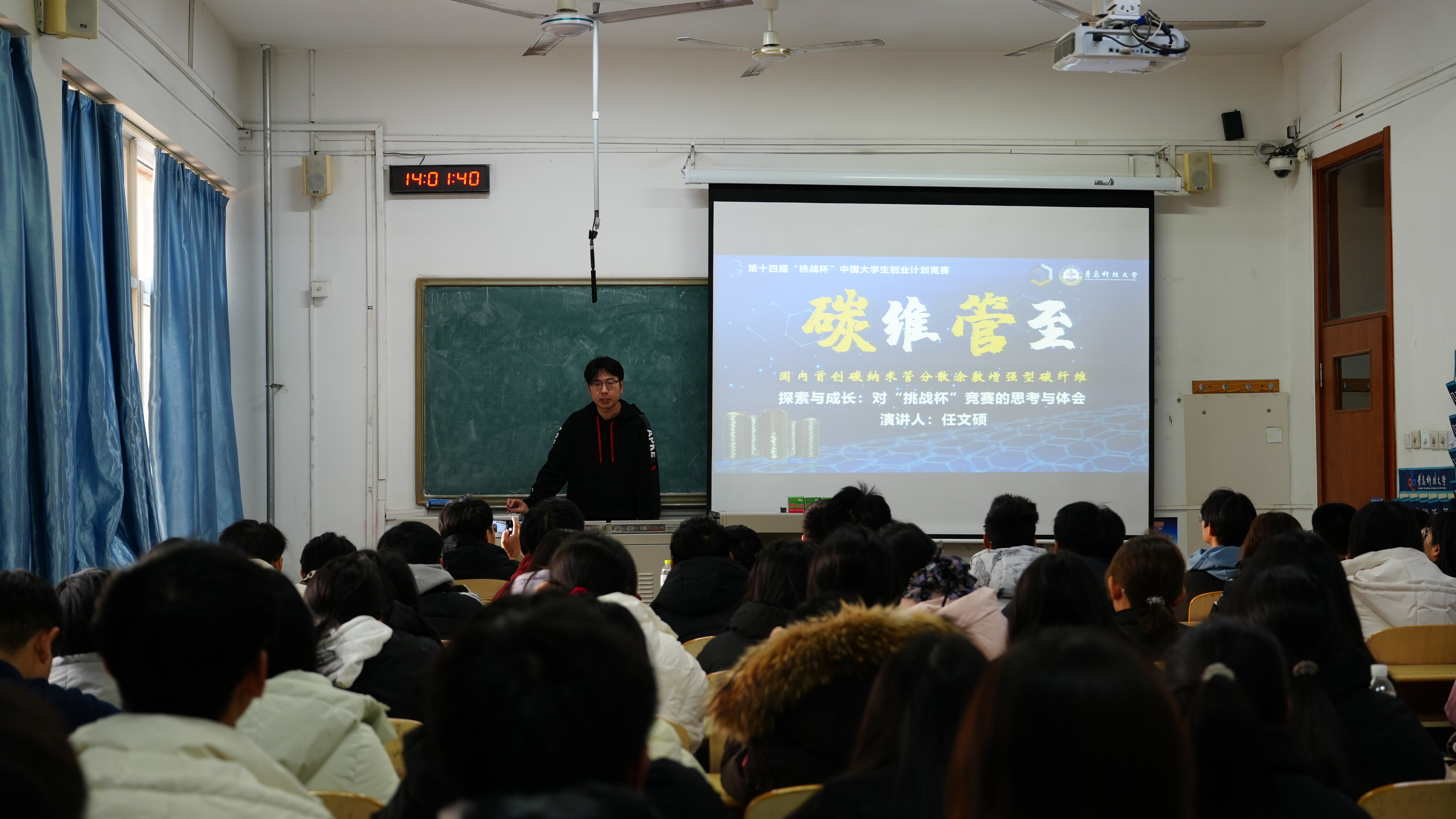 培训会上,葛瀚文和任文硕进行了获奖经验分享。他们分别分享了《“花”废为宝——人工智能辅助花废高值化利用助力乡村振兴》项目和《碳维管至——国内首创碳纳米管分散涂敷增强型碳纤维》项目在参赛过程、科研攻关、团队合作等方面的宝贵经验,不仅展示了他们在科技创新方面取得的优异成绩,也激发了在场同学们对参与科研创新的兴趣。