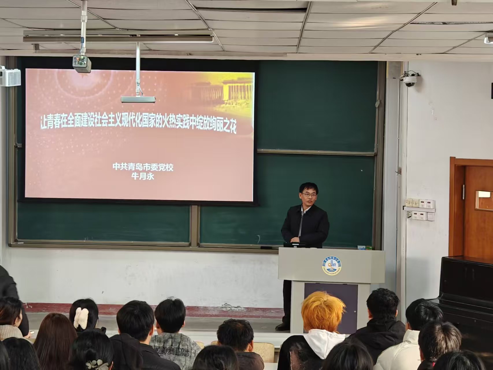 2月28日,XC体育在2教111教室开展新学期“思政第一课”,邀请中共青岛市委党校中共党史党建与党性教育教研部副主任、副教授牛月永作了《让青春在全面建设社会主义现代化国家的火热实践中绽放绚丽之花》专题报告。公司党委书记周宪锋、党委副书记刘浩、全体辅导员,员工干部、员工党员以及入党积极分子代表参加此次会议。会议由刘浩主持。