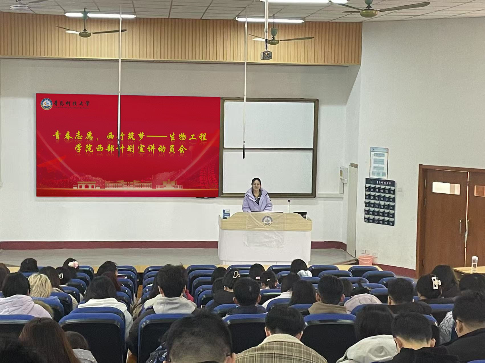 吕珊珊系统解读了西部计划的政策内涵,从项目背景、服务领域、保障机制等方面展开说明,重点结合生物工程专业特色,分析了在乡村振兴、生态治理、基层医疗等领域的实践机遇以及“微生物技术助力特色农业升级”“生物医药服务边疆健康事业”等适配方向,生动诠释了“将实验室成果书写在西部大地”的使命担当。宣讲会现场气氛热烈,同学们深受鼓舞,希望能用专业所长服务西部发展。