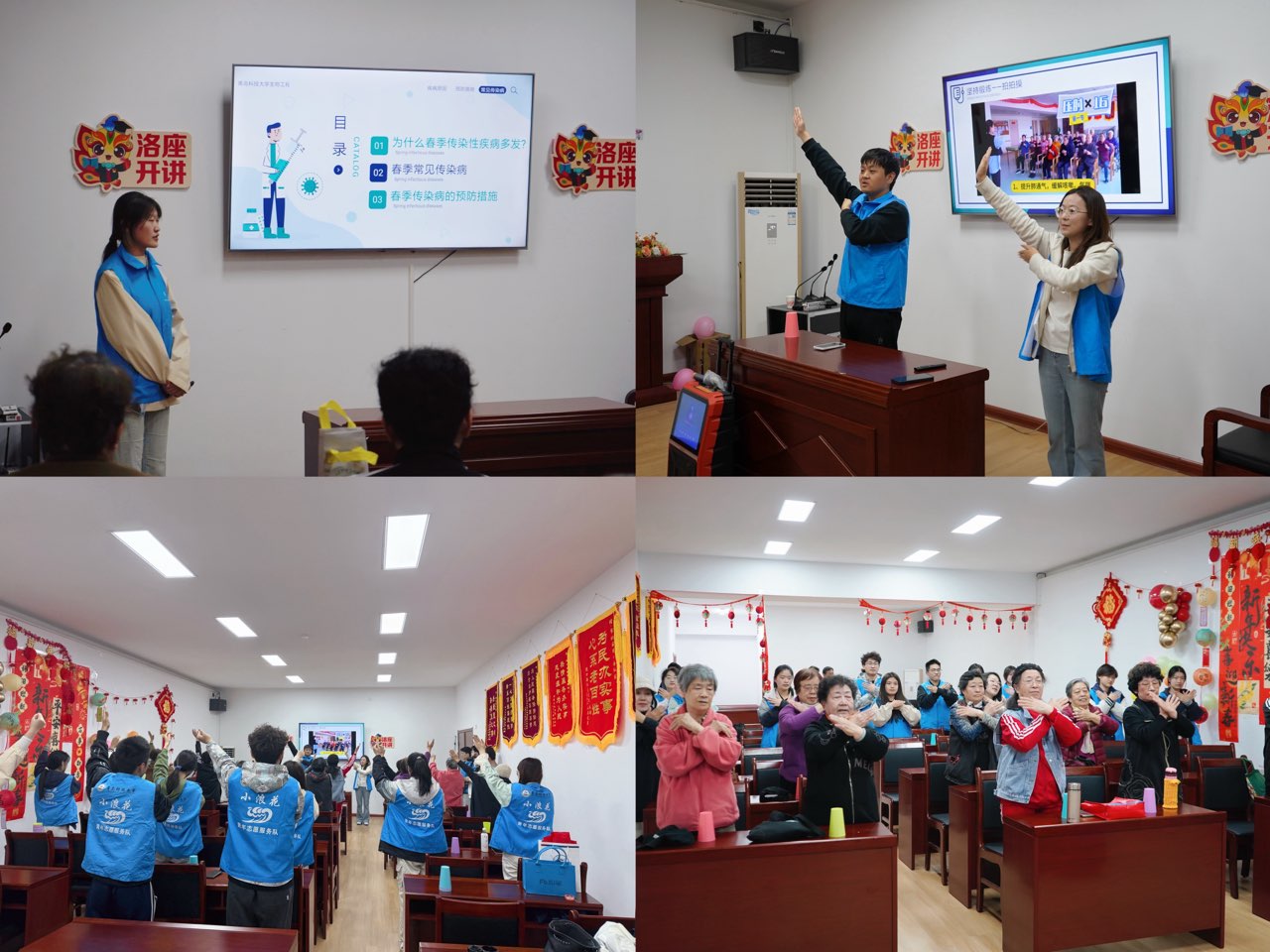 活动现场,志愿者们通过PPT讲解方式,用通俗易懂的语言详细介绍了例如流行性感冒、诺如病毒引起的感染性腹泻的特点,让老人们对这些传染病有了更直观的认识。在预防措施方面,志愿者们重点强调了接种疫苗的重要性。对于家中有漏种情况的,要及时到社区卫生服务中心或乡镇卫生院接种。活动现场还设计了有趣的“拍拿放”热身活动和一套简单易学的“清肺拍拍操”。“拍拍操”融入了中医穴位养生理念,有利于促进气血循环,增强身体的抵抗力。志愿者们一边耐心地示范动作,一边详细讲解每个动作对应的穴位及其功效。老人们积极参与,现场气氛热烈,有很多的老人表示以后会将“拍拍操”融入日常生活。