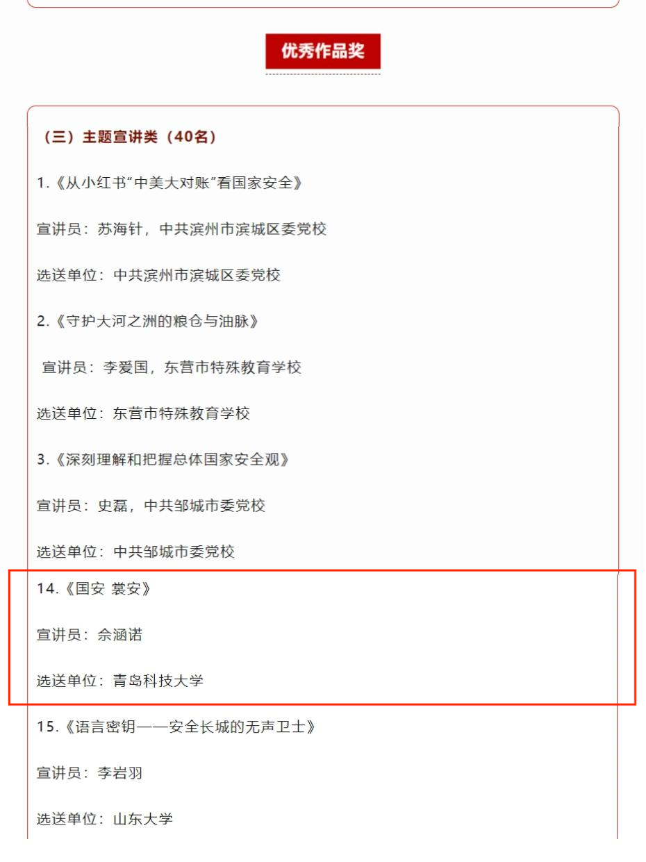近日,省委国安办、省委宣传部、省委政法委、团省委、省教育厅、省文化和旅游厅、省国家安全厅联合主办山东省第五届全民国家安全宣传教育创意大赛,面向全社会广泛征集创意视频、文艺作品、主题宣讲3类作品。期间,各级各有关部门单位紧紧围绕大赛主题,迅速行动、广泛发动,共征集各类参赛作品数量近8000件,参赛人员遍布全国20余个省、自治区、直辖市。根据组委会评审结果,共评选获奖作品193件、优秀组织奖80个。XC体育佘涵诺同学的宣讲作品《国安·裳安》荣获主题宣讲类优秀作品奖。