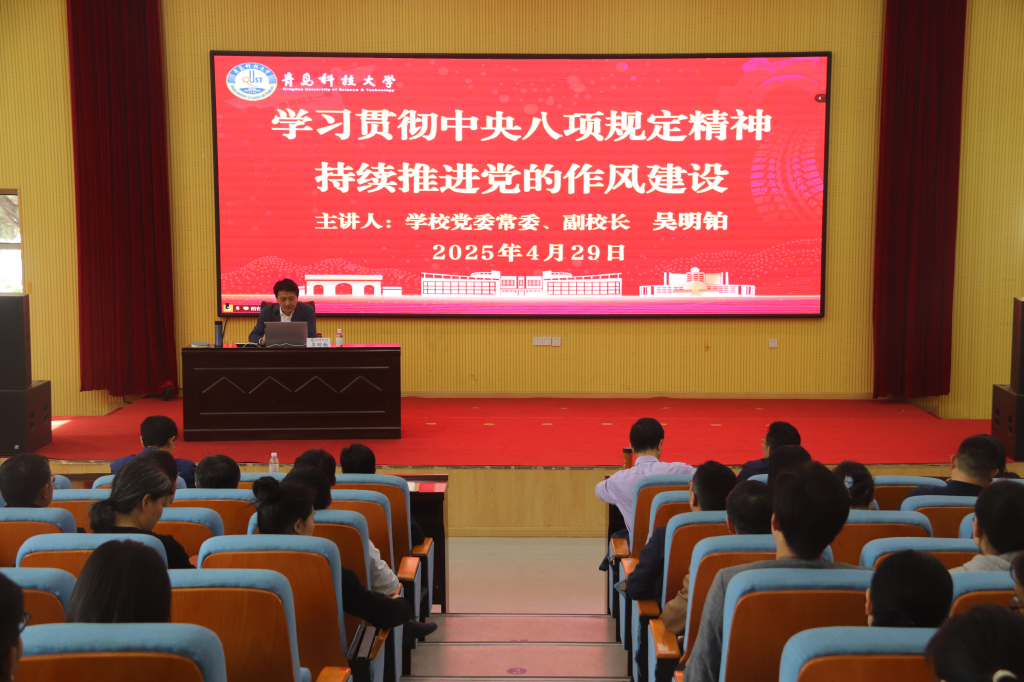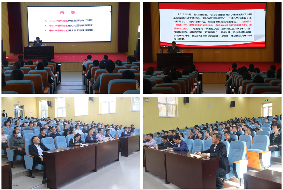 为深入贯彻中央八项规定精神,推动党员作风建设走深走实,4月29日下午,公司党委常委、副董事长吴明铂在四方校区尚舜报告厅为分管、联系单位讲授《学习贯彻中央八项规定精神,持续推进党的作风建设》专题党课。科技处、人文社科处、图书馆、学报编辑部、化公司、继续教育公司、XC体育等教师党员参加党课学习。继续教育公司党总支书记郭曰铎主持党课。