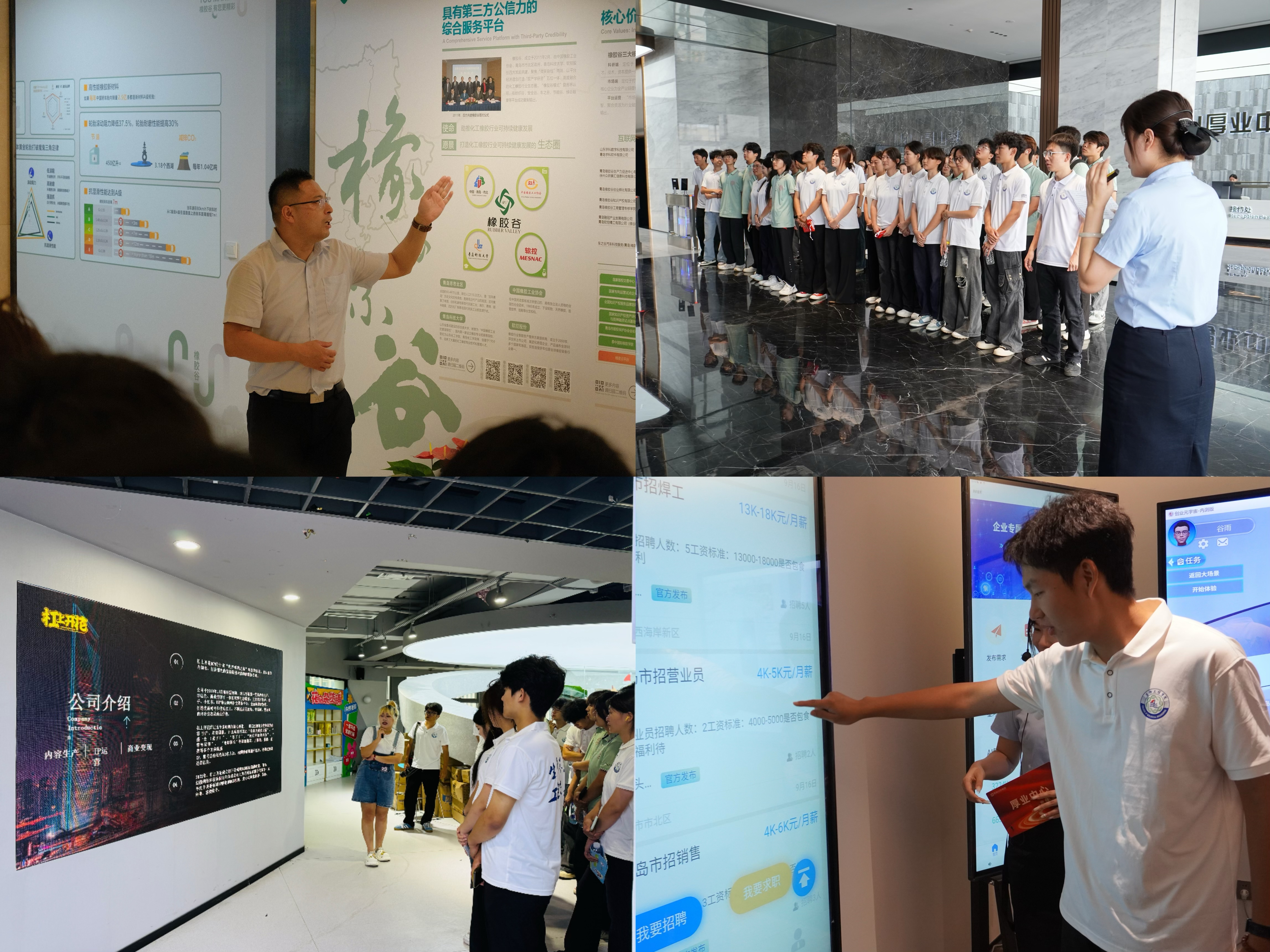 创业巴士首站抵达橡胶谷省级创业示范园,通过园区负责人的详细介绍,师生系统了解了针对老员工创业的专项扶持政策和多个成功案例,并在参观同时开启打卡集章活动,感受园区浓厚的创新创业氛围。随后队伍前往青岛市高能级创业孵化园区赋能中心,在参观开放式办公空间、独立孵化单元和多功能路演厅的过程中,亲身体验一站式创业服务。在白鹿港澳台青年创新创业实践基地,师生们来到“杠上开花”互联网公司,近距离了解其互联网平台的运营模式与发展现状,直观感受到数字经济领域的创新活力与创业生态。