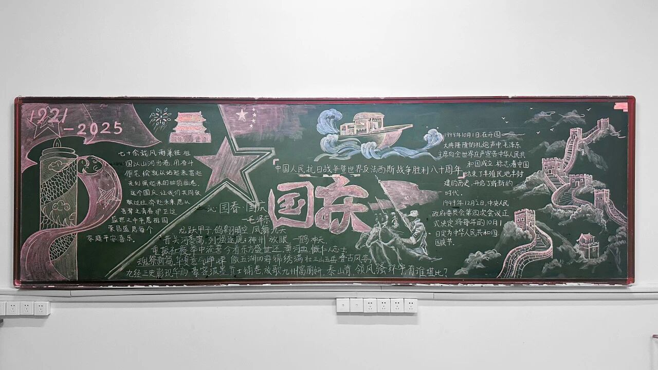 一方黑板,满是赤诚。XC体育开展“手绘家国梦,板报贺华诞”主题黑板报创作活动。同学们以黑板为画布,以彩笔为媒,将对祖国的祝福与对时代的赞颂融入一幅幅生动的板报作品中。从开国大典的庄严时刻,到新时代的科技腾飞;从壮丽山河的绝美画卷,到人民幸福的生活图景……同学们用细腻的笔触、鲜明的色彩,勾勒出祖国76年的辉煌历程与盛世风华。每一块黑板报都是一处爱国教育的生动课堂,让路过的师生在驻足观赏间,沉浸式感受祖国的蓬勃发展,厚植家国情怀。