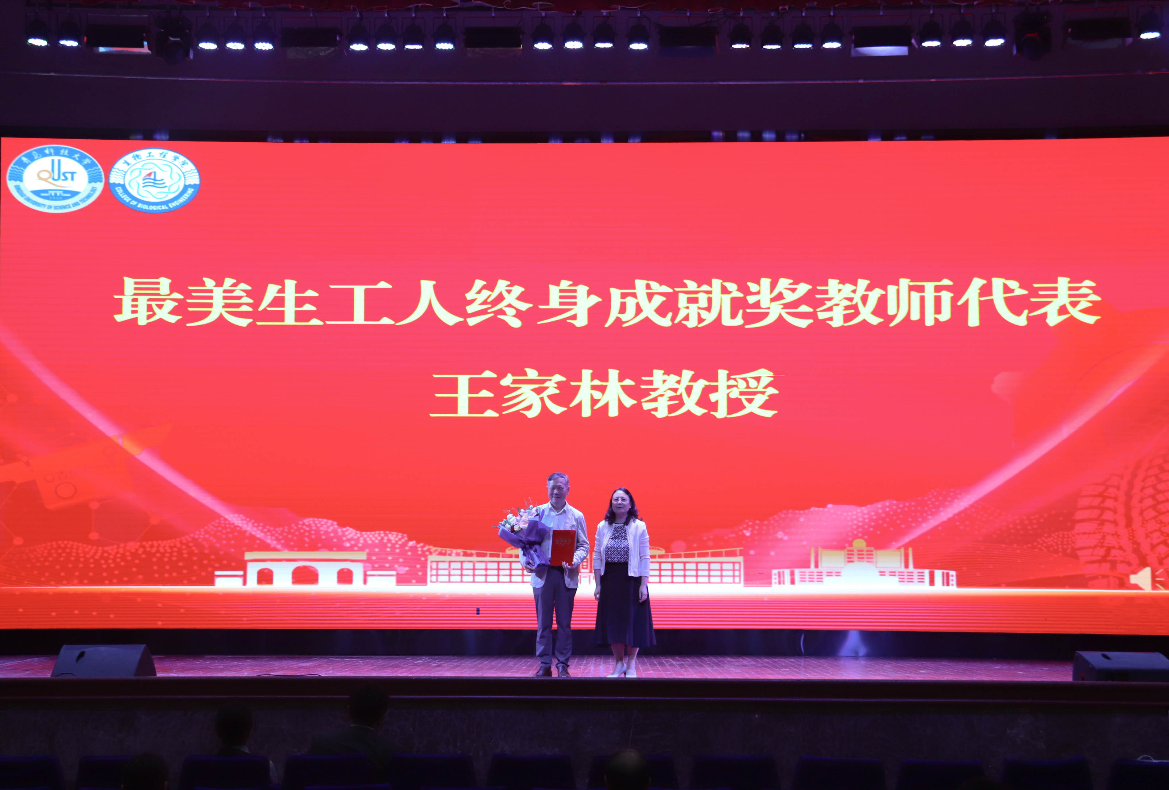 马翠萍为“最美生工人”终身成就奖教师代表王家林教授颁发荣誉证书。