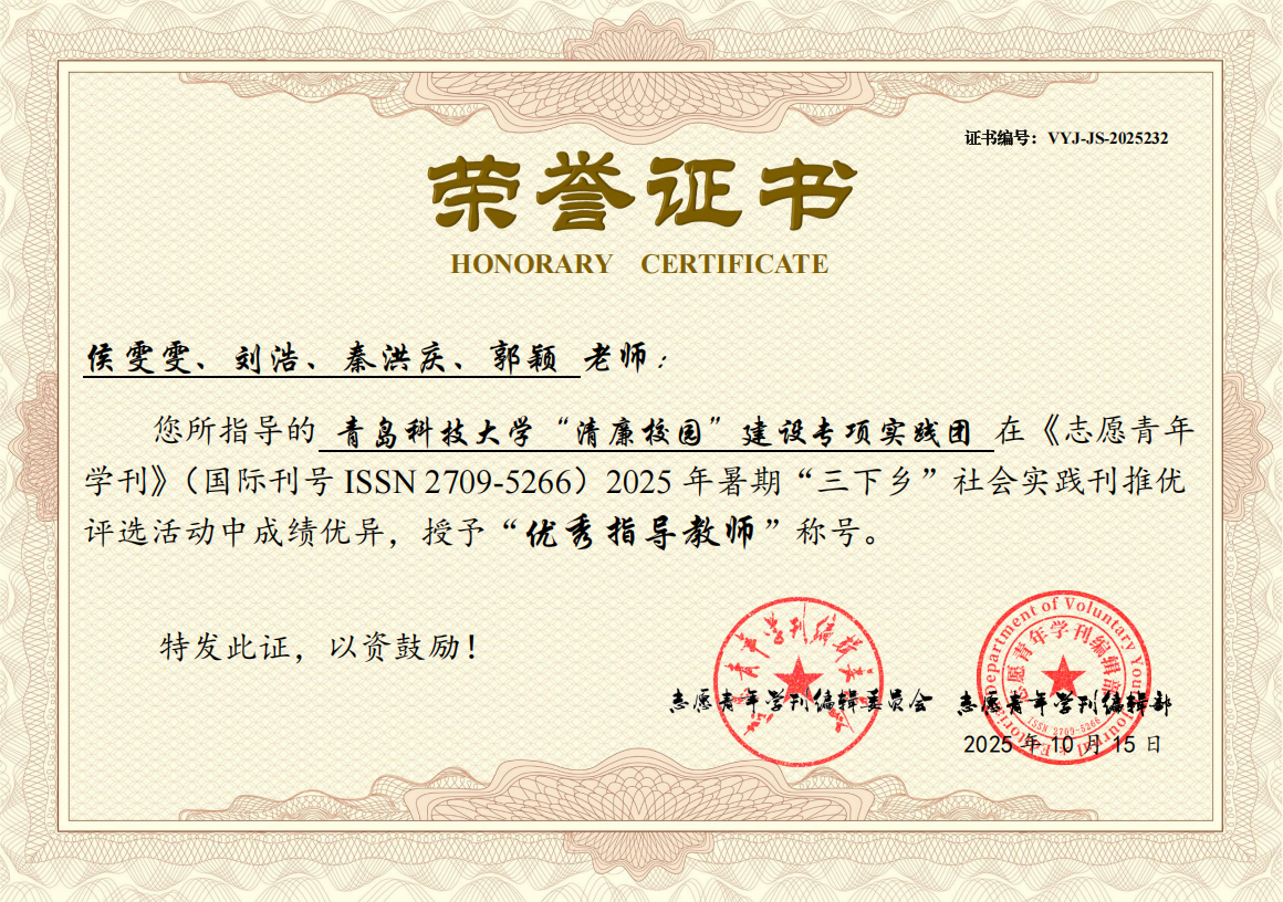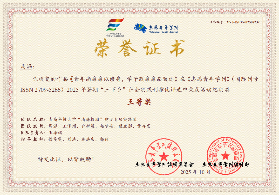 近日,《志愿青年学刊》(ISSN 2709-5266)编委会公布了2025年暑期“三下乡”社会实践专刊活动纪实类推优评选结果,XC体育“清廉校园”建设专项实践团获评三等奖,侯雯雯、刘浩、秦洪庆、郭颖获评优秀指导教师。