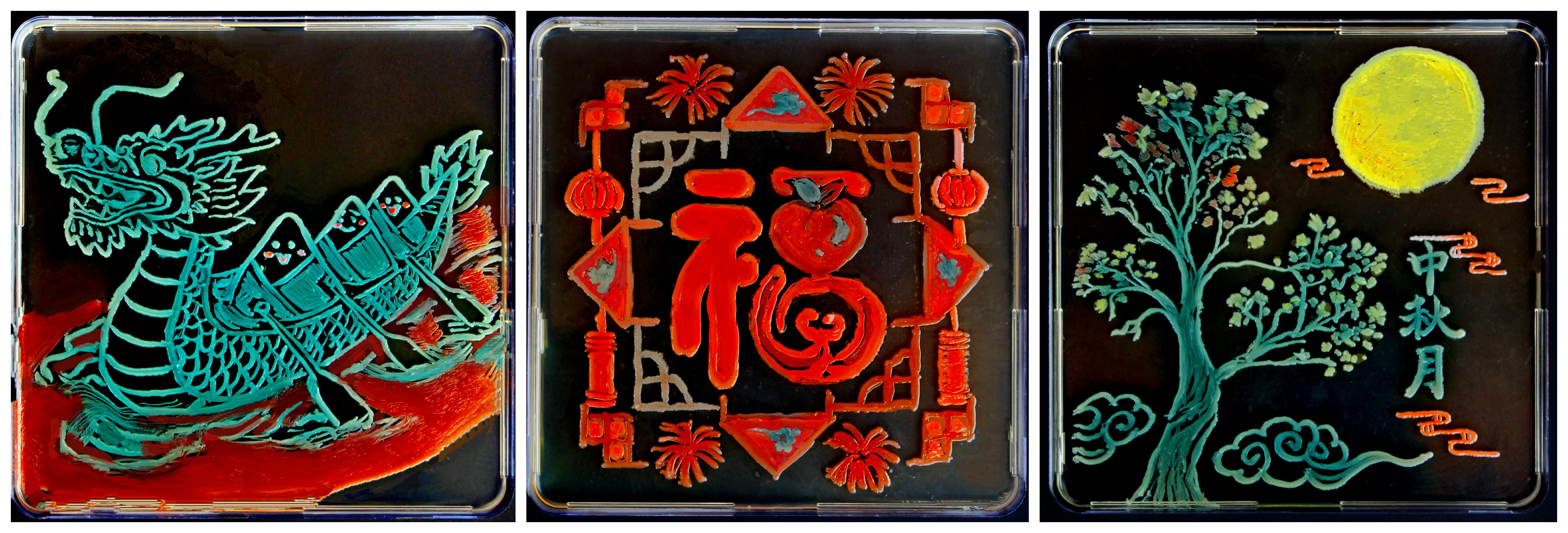 “菌绣山河队”由生物工程专业23级刘佳乐、张宇等同学组成。为打造参赛作品,团队在史振平老师的悉心指导下,历时两个月潜心钻研,从海洋微生物菌株的筛选、培养条件的优化,到艺术构图的设计、显色效果的调控,每一个环节都凝聚着团队的智慧与汗水。作品《福州月——三重礼赞》以微生物生长形成的独特纹理为“画笔”,其中,福字象征吉祥,以菌落“书写”而成,寓意生命繁衍与福气生长,体现“福泽绵长”的传统祝福;龙舟以动态菌落模拟竞渡场最,既呼应端午节的活力,又暗喻微生物世界如龙舟般奋勇向前,充满生机,展现自然之力与文化精冲的共鸣;桂花代表丰收与高洁,通过微生物的精细生长,传递“桂子飘香”的美好意境,隐喻自然界的微观奇迹。评委们高度评价该作品“将微生物的生命力转化为艺术语言,让科学之美可触可感”。
