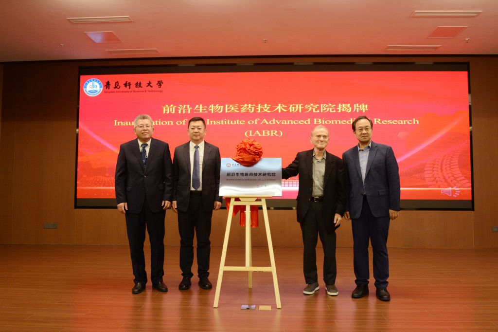 仪式上,Randy W.Schekman、杨天梅、韩利军、前沿生物医药技术研究院经理窦效伟共同为研究院揭牌。