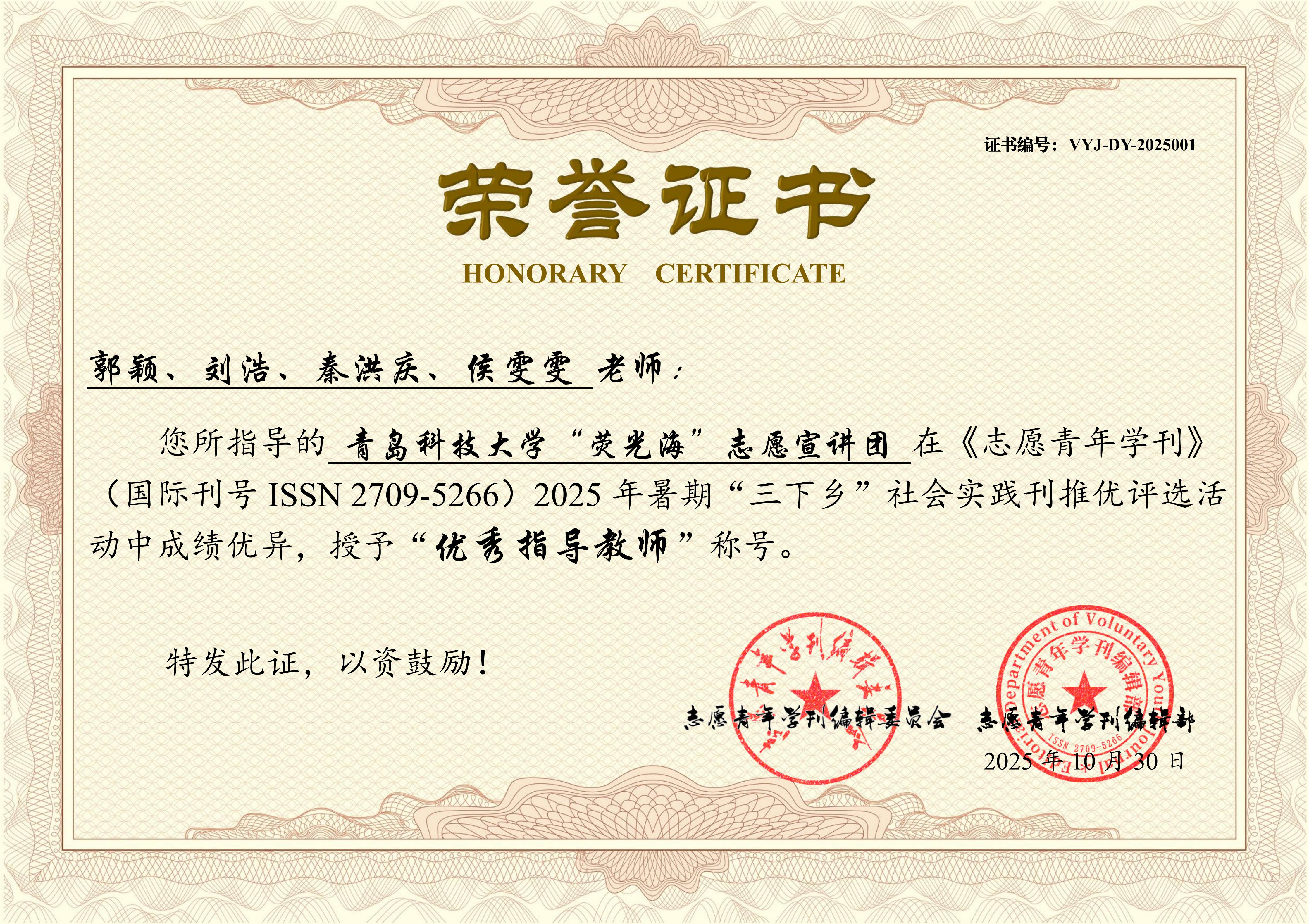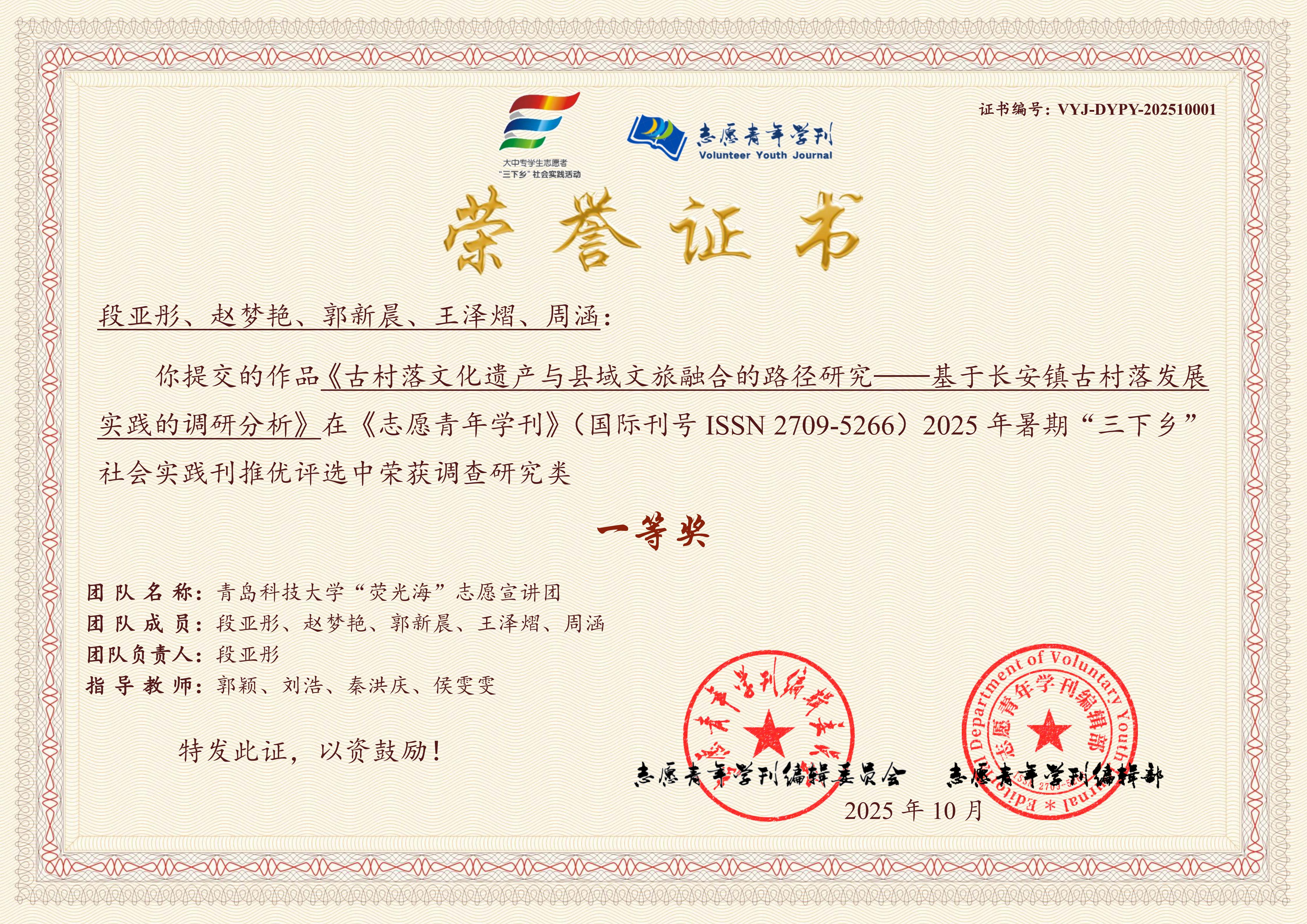 近日,《志愿青年学刊》(ISSN 2709-5266)编委会公布了2025年暑期“三下乡”社会实践专刊调研报告类推优评选结果,由XC体育“荧光海”志愿宣讲团成员段亚彤、赵梦艳、郭新晨、王泽熠、周涵撰写的调研报告《古村落文化遗产与县域文旅融合的路径研究——基于长安镇古村落发展实践的调研分析》获评一等奖,郭颖、刘浩、秦洪庆、侯雯雯获评优秀指导教师。