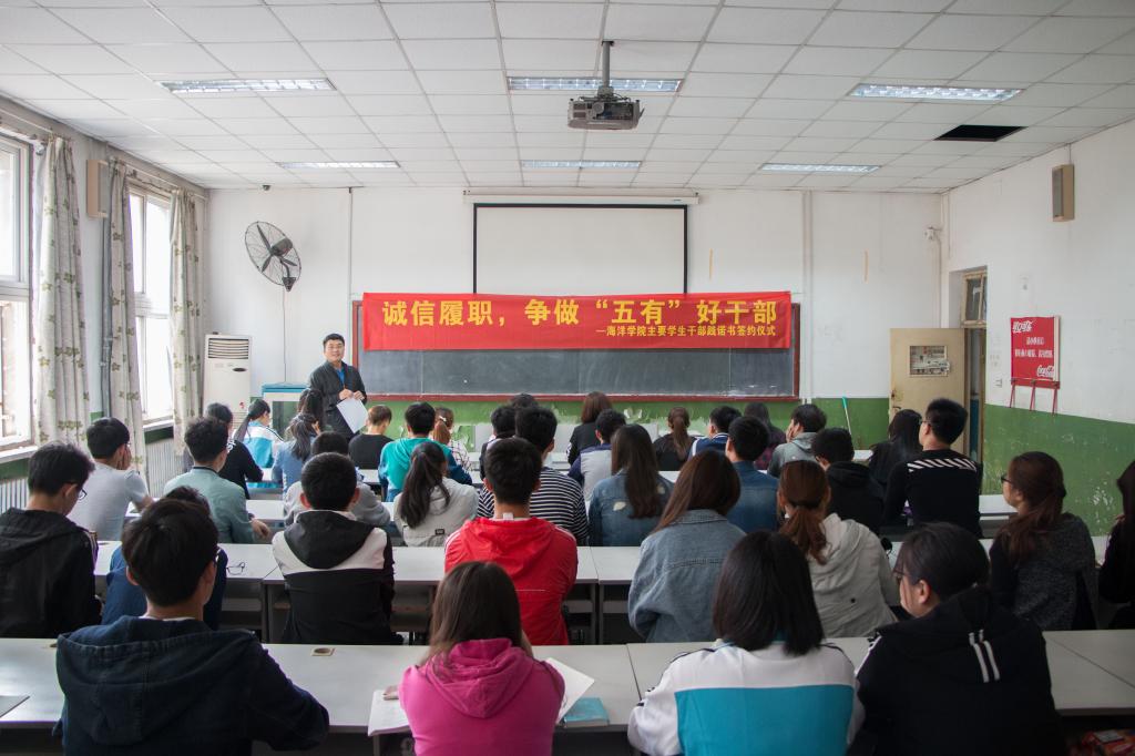 高举团旗跟党走,争做“五有”好青年,青春建功双一流。5月9日下午,海洋公司2016级各班长、舍长以及卫生委员在分团委会议室参加了“诚信履职,争做五有好青年” 主要员工干部践诺书签约仪式。本次仪式由海洋公司分团委组织召开,公司员工工作负责人卢中彬、分团委老师季朝阳出席了仪式。