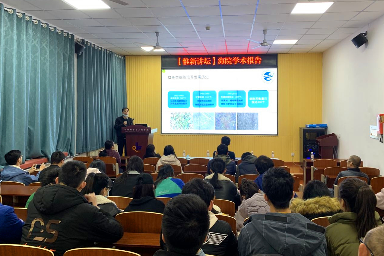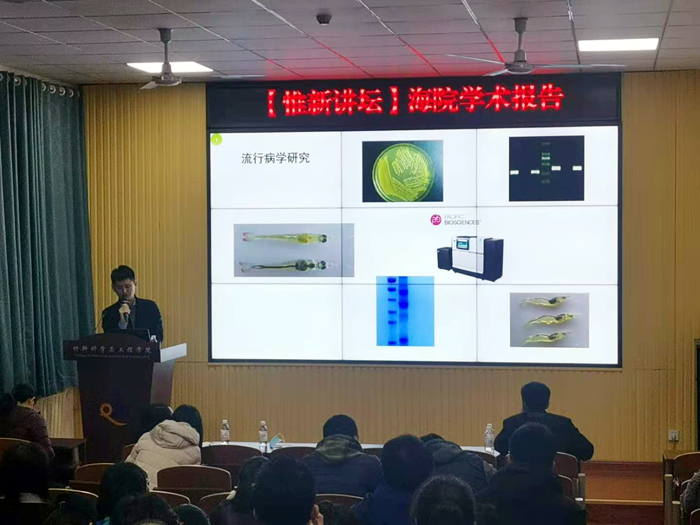 国家基金申报专题报告会后,海洋公司在四方校区材料公司楼101报告厅召开了2场【惟新讲坛】海院学术活动月之学术报告,来自中国水产科学研究院黄海水产研究所的邵长伟研究员首先做了题为“鱼类细胞培养及半滑舌鳎性别大小异形机制研究”的学术报告,董宣副研究员做了题为“水生动物流行病学与生物安保”的学术报告,海洋公司教师及研究生到场聆听了学术讲座。报告会结束后,与会的老师、员工与邵长伟研究员、董宣副研究员进行了深入的学术交流和讨论。