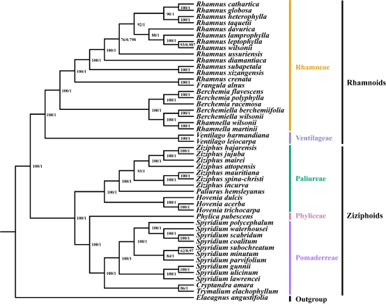 在充分审视前人研究的基础上,研究基于目前数量最多的叶绿体全基因组序列进一步探究了鼠李科的系统发育关系。系统发育分析结果得到了极高的支持率,支持前人基于形态和分子数据将鼠李科分为蔓枣分支、枣分支和鼠李分支的分类结果,并提出将长叶冻绿(Rhamnus crenata)归入裸芽鼠李属(Frangula)的建议。这些结果为理解鼠李科的系统发育关系提供了叶绿体全基因组层面的全新视角,同时也为科学合理地利用和保护鼠李科植物资源提供了坚实的科学依据。