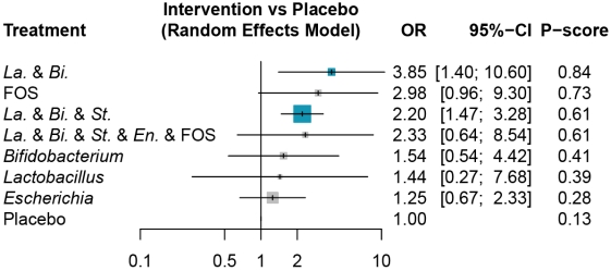 图1 比较不同微生态制剂与安慰剂在急性UC患者中的临床缓解率的森林图。La.:乳杆菌属;Bi.:双歧杆菌属;St.:链球菌属;En.:肠球菌属;FOS:低聚果糖。