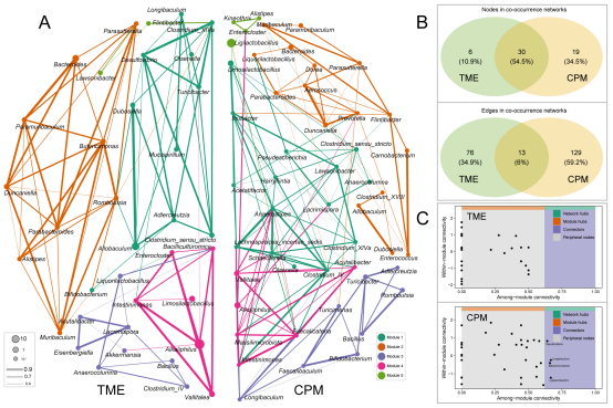图2 不同处理组小鼠肠道微生物属水平网络分析。(A)美沙拉嗪治疗组(左)和联合治疗组(右)网络;(B)两个网络之间节点和边的维恩图;(C)基于节点拓扑角色的Zi-Pi图。网络中的每个节点代表一个细菌属。节点大小表示一个属的平均相对丰度。边宽度表示支持此连接的相关性值。节点和边的颜色代表不同的模块。TME:治疗性美沙拉嗪;CPM:复合益生元联合美沙拉嗪。