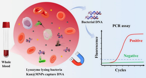 图1.Kan@MNPs提取血液中病原菌DNA与PCR检测示意图