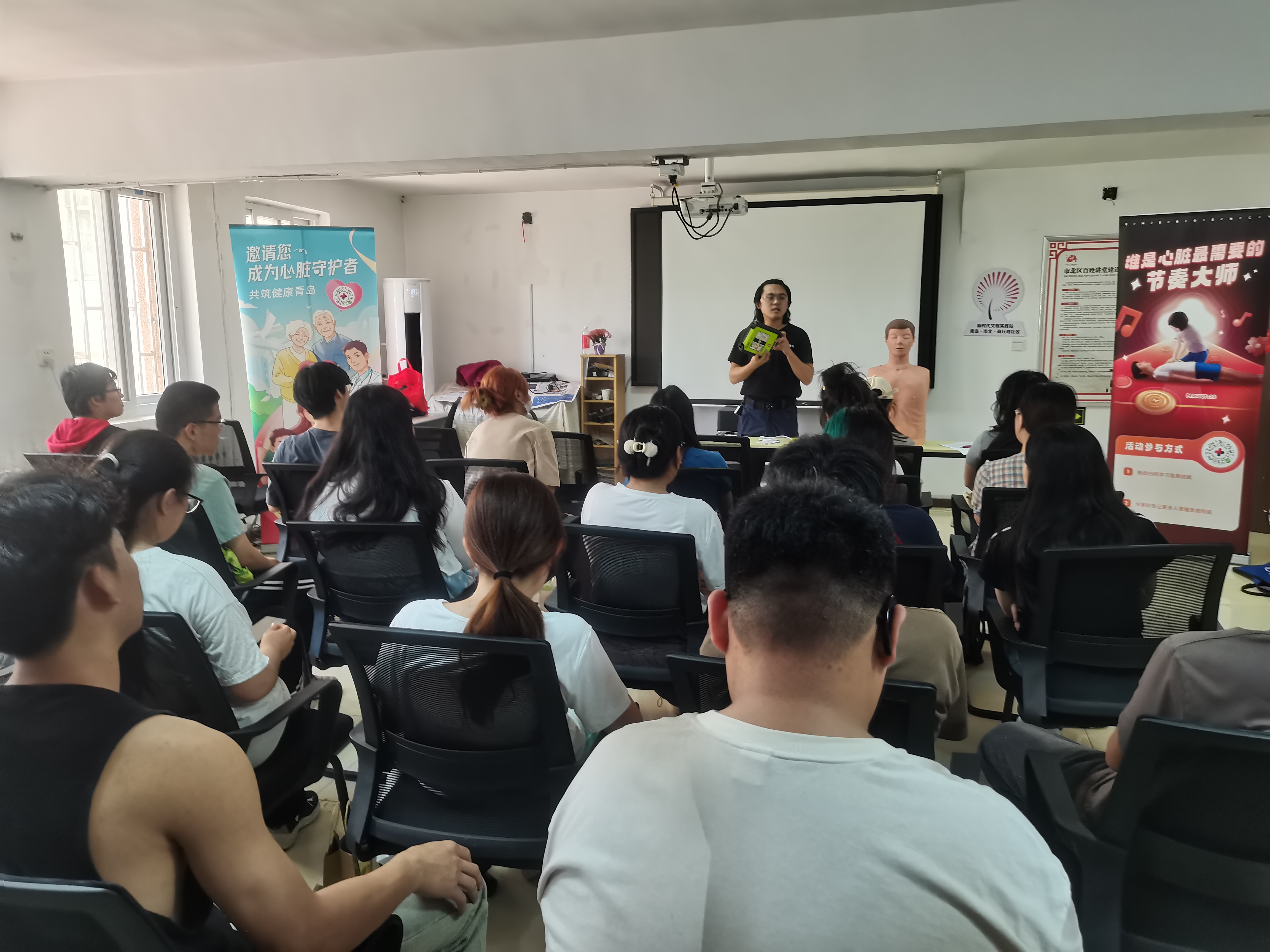 此次活动采用理论讲授与技能实操相结合的方式,在活动现场,海洋公司青年志愿者配合专业指导老师为社区居民进行急救知识讲解、急救情景剧演示和急救技能现场培训等应急救护知识培训。