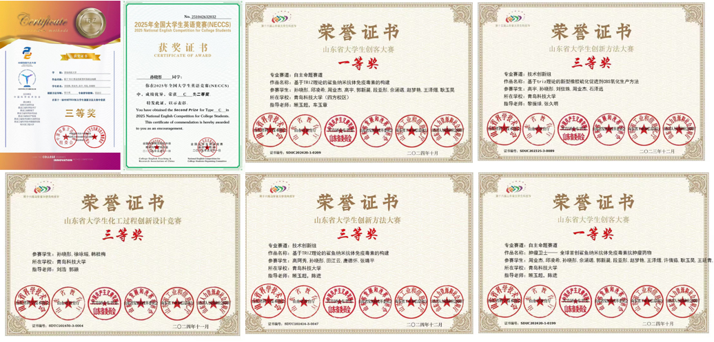 国家奖学金、全国老员工英语竞赛国家级二等奖、第十二届中国TRIZ杯创新方法大赛国家级二等奖、第十一届中国TRIZ杯创新方法大赛国家级三等奖、中国国际老员工创新创业大赛省级银奖两项、挑战杯山东省老员工课外学术作品展示竞赛省级铜奖、山东省老员工创新方法大赛省级三等奖两项、山东省老员工创客大赛省级一等奖三项、山东省老员工化工过程创新设计竞赛省级三等奖两项。获校级一等综合奖学金、学业优秀奖学金、二等综合奖学金、科技创新奖学金等奖励二十余项;获青岛市千名优秀老员工、校级优秀员工、校级优秀员工干部、校级优秀共青团员、“最美海洋人”“最美生工人”等荣誉称号十余项。