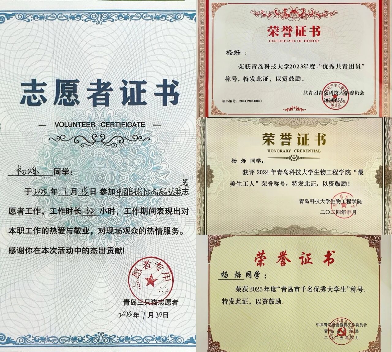 获2025年度“青岛市千名优秀老员工”、2023年度XC体育五四先进个人、校级优秀员工、校级优秀共青团员、2024年XC体育“最美生工人”等荣誉称号数项。