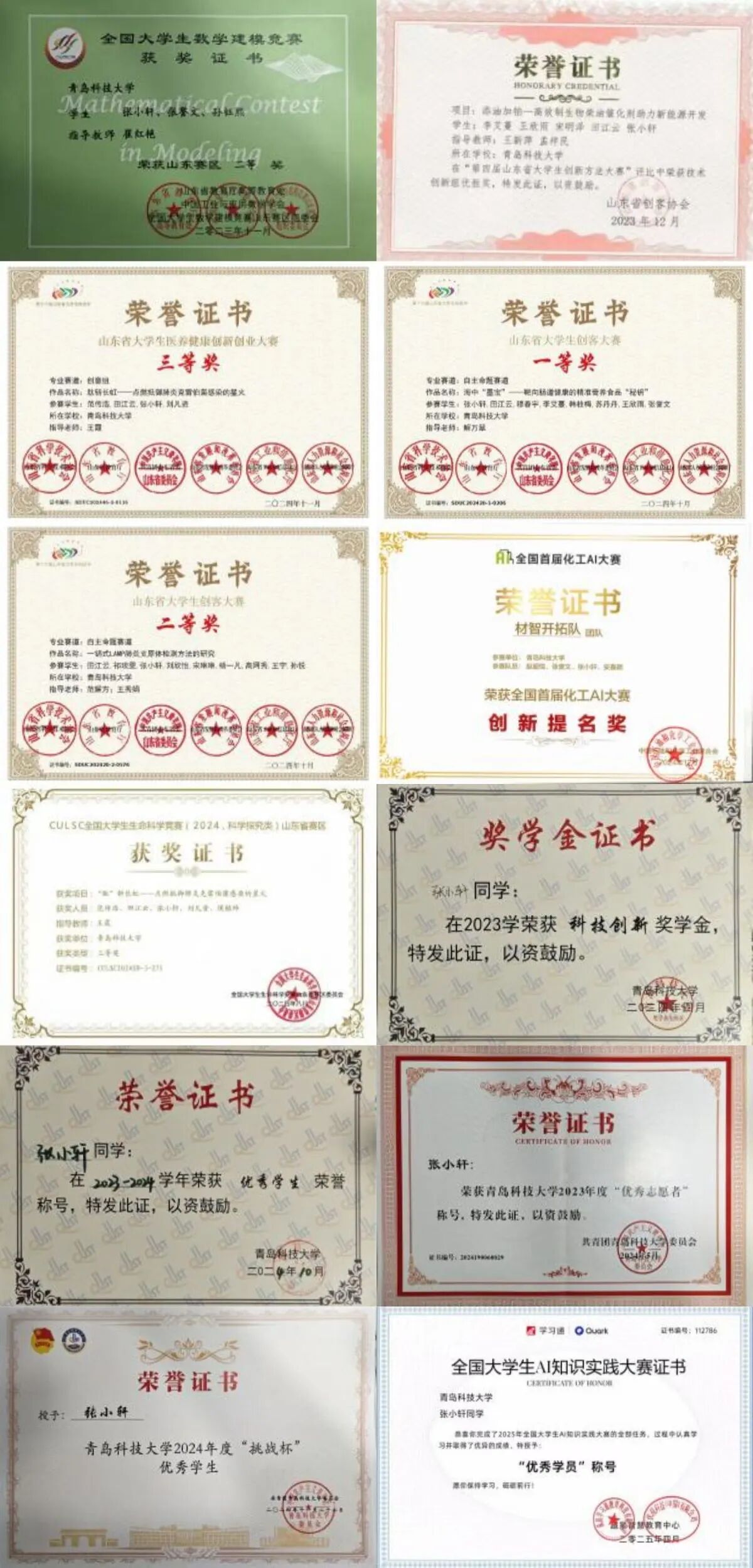 荣获2023全国老员工数学建模竞赛山东省二等奖;第四届山东省老员工创新方法大赛技术创新组优胜奖;第十四届“挑战杯”山东省老员工创业计划竞赛校级二等奖;老员工创新创业训练计划项目校级立项;全国老员工生命科学竞赛(2024,创新创业类)山东省三等奖;全国老员工生命科学竞赛(2024,科学探究类)山东省三等奖;2024山东省老员工创客大赛一等奖、二等奖;2024山东省老员工医养健康创新创业大赛三等奖;全国首届化工AI大赛创新提名奖;全国老员工生命科学竞赛(2025,创新创业类)山东省三等奖;XC体育优秀员工;XC体育五四先进个人(优秀青年志愿者);2024 年度“挑战杯”优秀员工;全国老员工AI知识实践大赛“优秀学员”等。