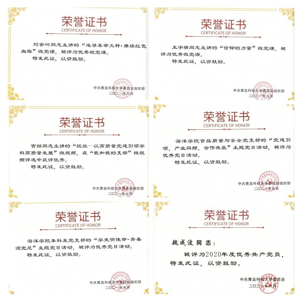 公司本科生党支部书记刘金岭主讲的“追寻革命火种,赓续红色血脉”微党课、海洋科学党支部王宇婧主讲的“信仰的力量”微党课获评校“优秀微党课”,轻化工程党支部书记吉喆主讲的“绽放-以高质量党建引领学科高质量发展”微视频在“我和我的支部”微视频评选中获评优秀,食品质量与安全党支部的“党建引领、产业同频、合作共赢”主题党日活动、本科生党支部“学史明使命,青春颂党恩”主题活动获评校“优秀党日活动”,海洋科学专业员工魏成波党获评校“2020年度优秀共产党员”。
