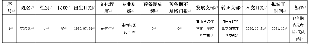 经海洋公司党总支研究生党支部研究,拟将范传凤同志转为中共正式党员,现将其有关情况予以公示。