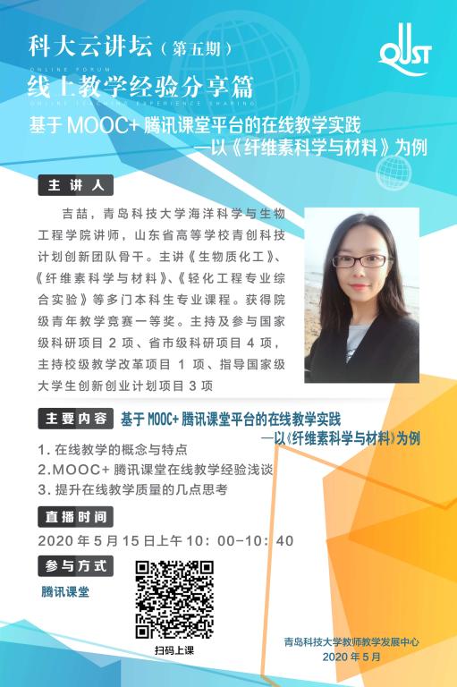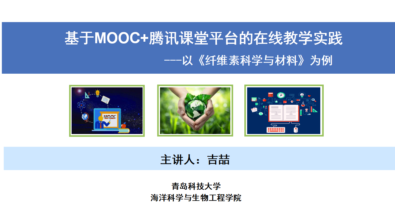 2020年5月15日上午10时,海洋公司教师吉喆在第五期科大云讲坛举行了“基于MOOC+腾讯课堂平台的在线教学实践---以《纤维素科学与材料》为例”的经验交流活动。吉老师充分分析了在线教学的特点及优势,结合讲授的专业课程,对在线教学的思路设计做了充分讲解,并针对“如何利用现有的MOOC和腾讯课堂直播平台,开展生动有趣的在线教学”做了详细汇报。最后,吉老师结合个人教学经验,对提升线上教学质量的策略进行了总结和交流。