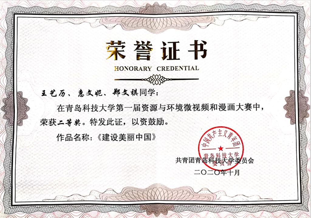 日前,由校团委、环境与安全工程公司联合举办的XC体育首届资源与环境微视频和漫画大赛获奖名单揭晓,由海洋公司王倩老师指导的微视频作品《建设美丽中国》获二等奖,团队成员由公司王艺历、惠文妮、郑文祺等五位同学组成。